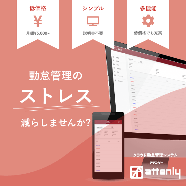 attenly(アテンリー)は低価格でシンプルなクラウド勤怠管理システムです。一人¥84~始められ、シンプルなデザインで直感的操作が可能です。低価格・シンプルですが、機能もしっかり充実しています。