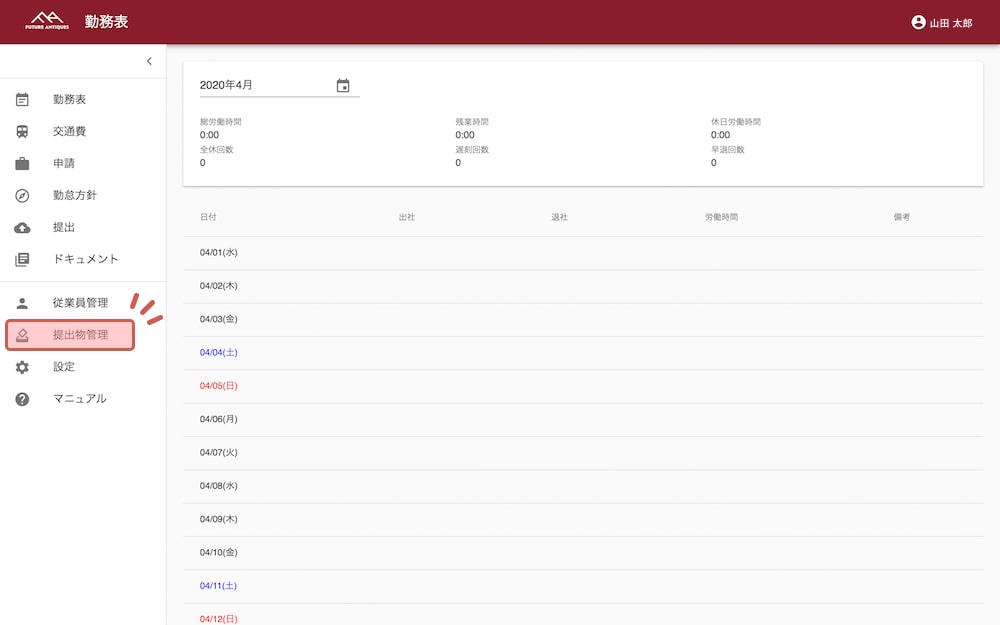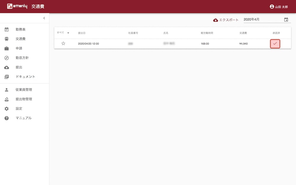 提出された「勤務表」「交通費」「添付ファイル(設定している場合)」を承認、未提出者の確認、休暇申請の承認をする事ができます。