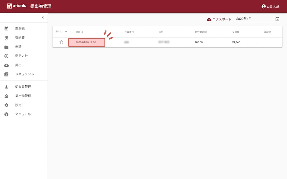 画面右上のカレンダーアイコンから対象の年月を選択することで、対象の提出物一覧が表示されます。