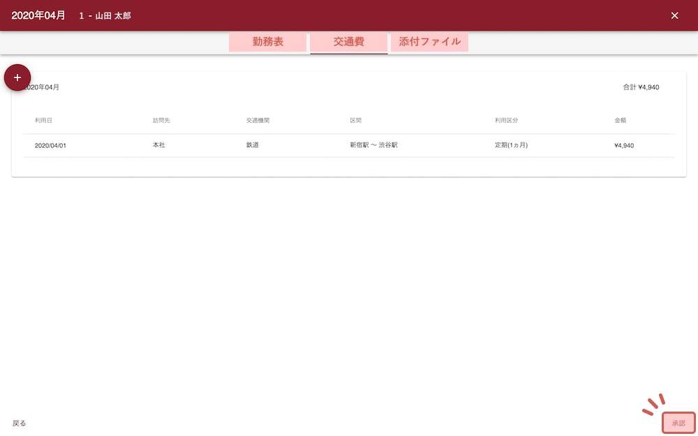表示される「勤務表」「交通費」「添付ファイル」を確認し、問題がなければ「承認」をクリックします。
