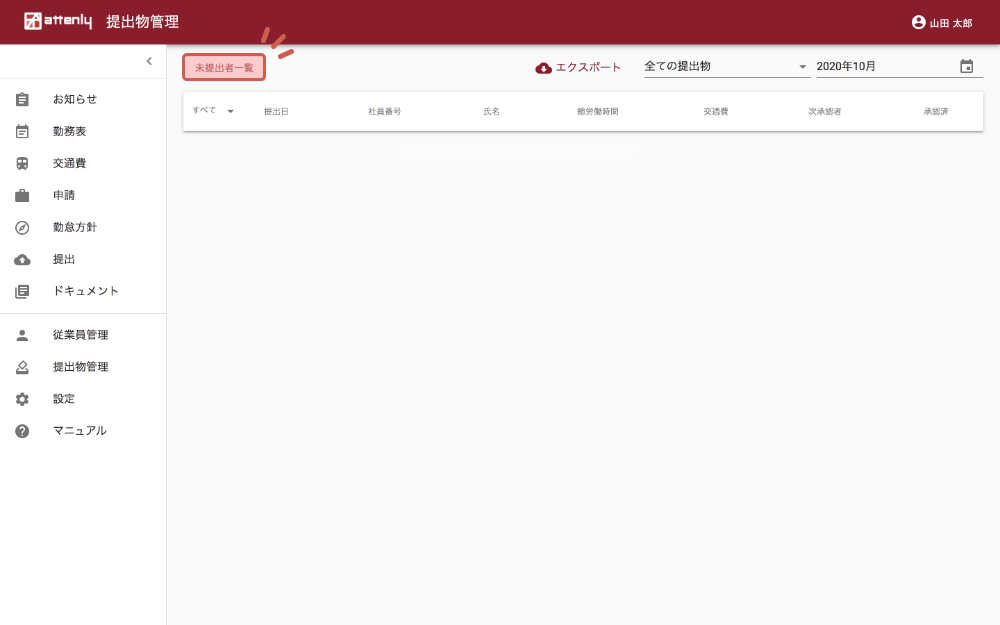提出物管理ページの左上「未提出者一覧」をクリックすると、表示している条件(全ての提出物/自分が承認者の提出物のみ)、月の未提出者が表示されます。
