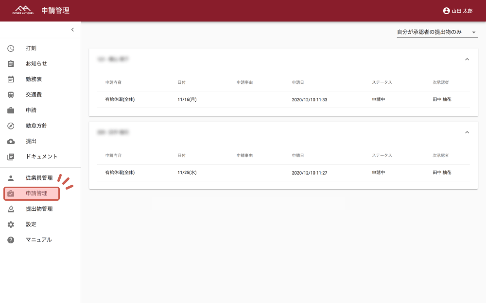 左のメニューバーより「申請管理」をクリックします。