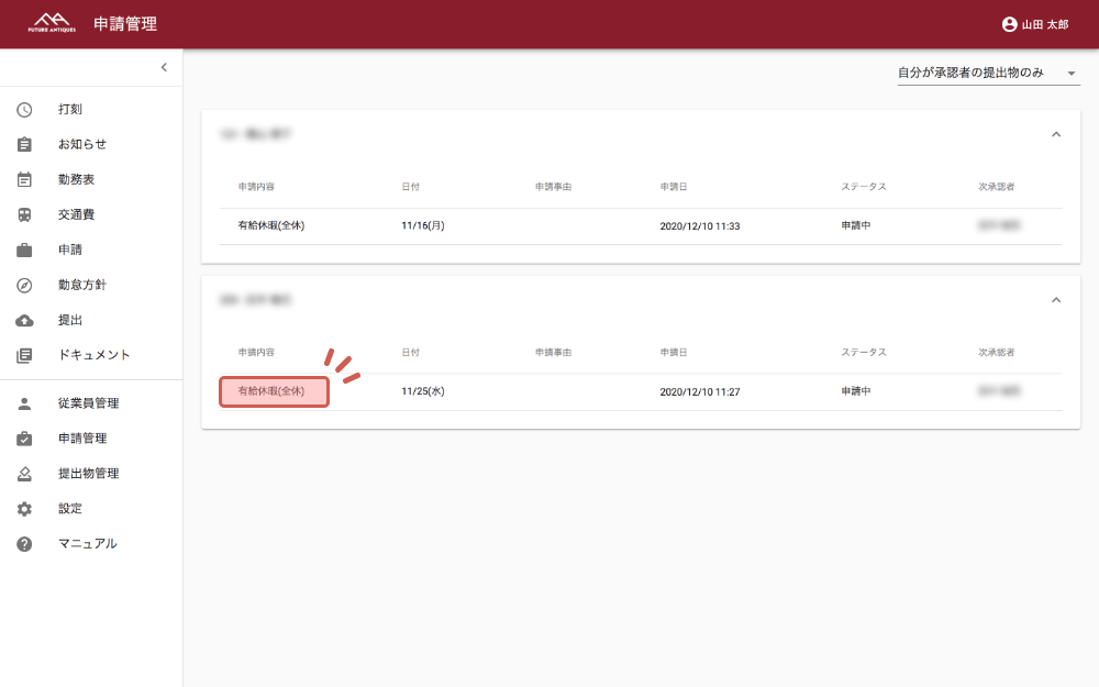 右上に「自分が承認者の提出物のみ」が表示されていることを確認します。表示されている申請が承認待ちの一覧になっています。確認したい申請をクリックします。