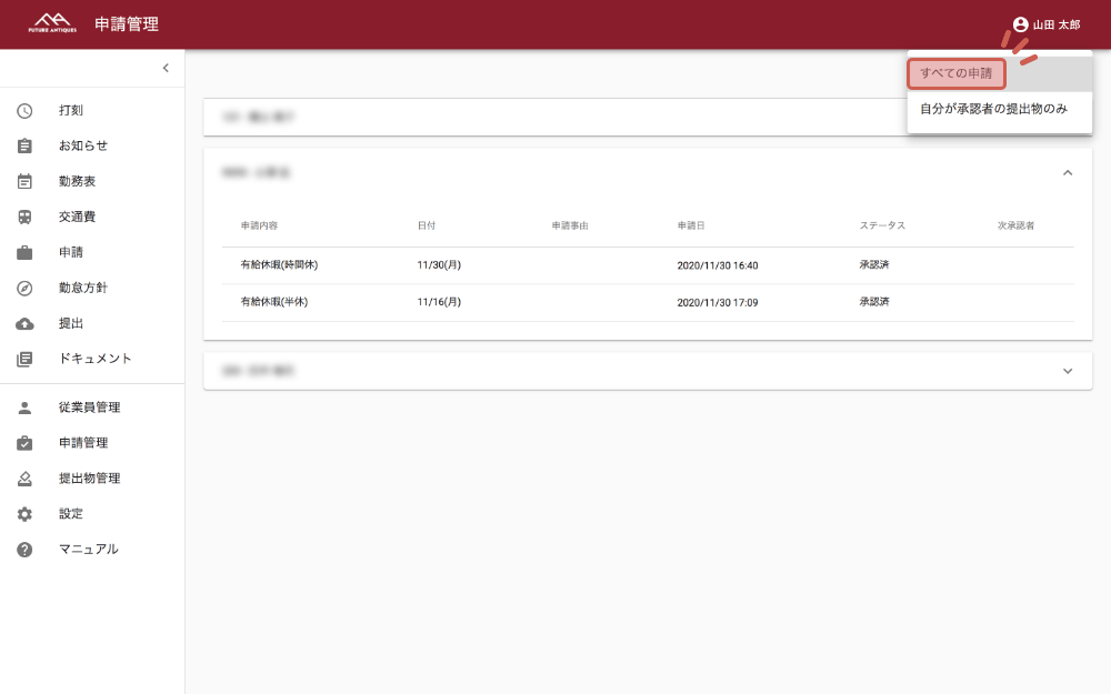 右上の「自分が承認者の提出物のみ」をクリックし「すべての提出物」を選択すると全ての申請が確認できます。