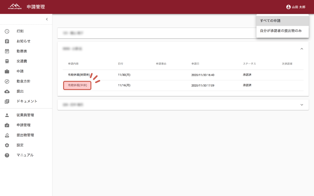 全ての申請が表示されるので、差し戻したい申請を探し、クリックします。