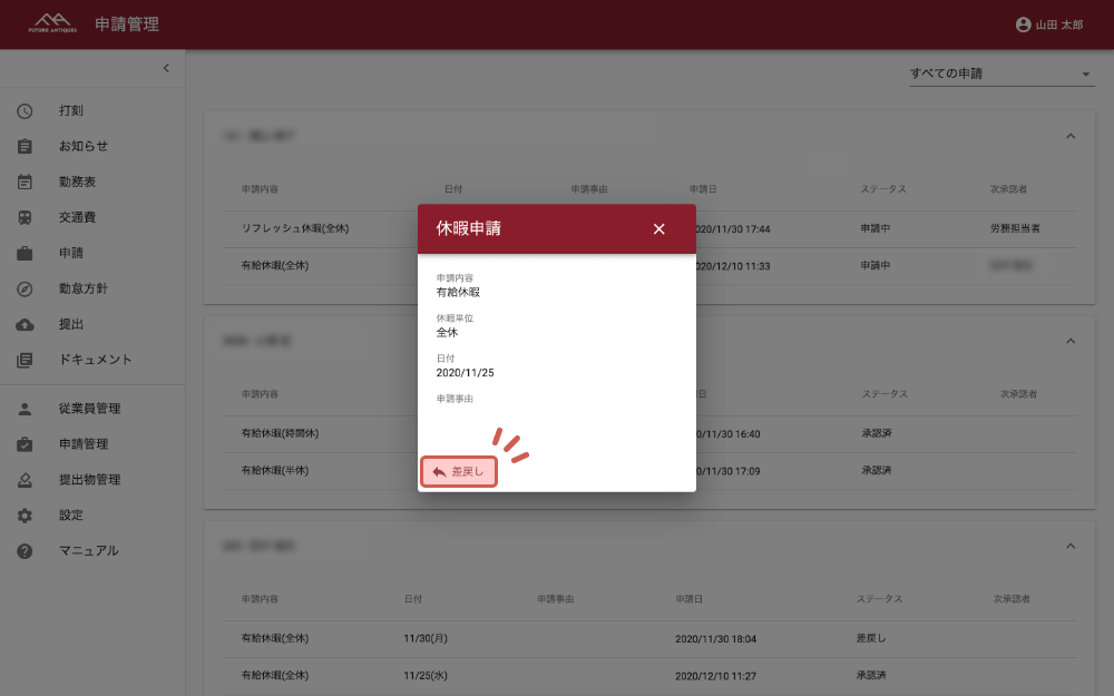 左下の「差し戻し」をクリックします。ユーザー側の申請ページの対象の申請ステータスが「差し戻し」に変化します。