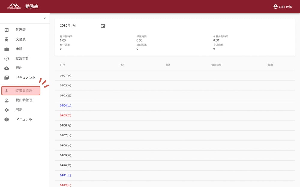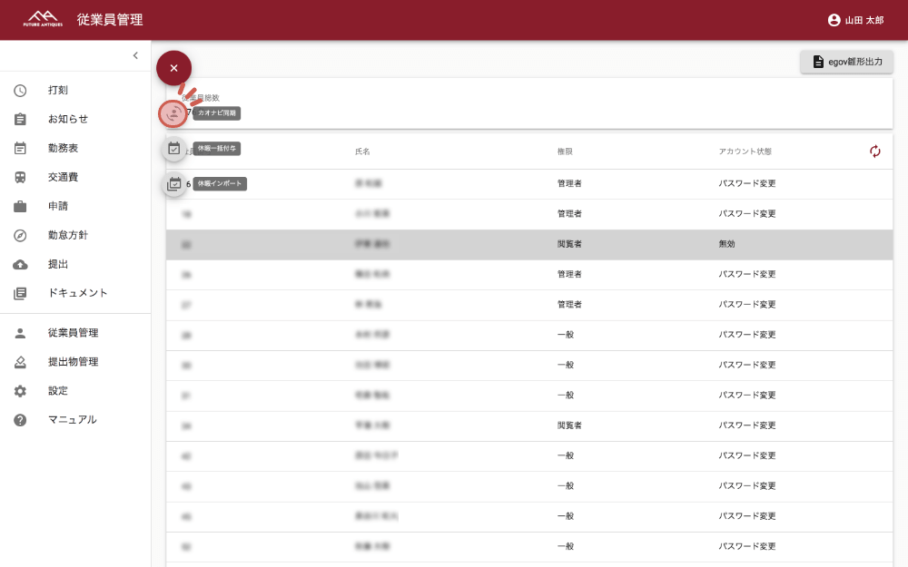 外部連携 2020.04.132020.12.09 カオナビに連携することが可能です。同期することで従業員情報が最新情報にすることができます。e-Govに連携した場合、雛形への出力が可能です。 カオナビ同期 従業員管理ページにアクセス 左のメニューバーより「従業員管理」をクリックします。 同期ボタンをクリック 画面右上の「カオナビ同期」をクリックすると、カオナビの情報と同期されます。