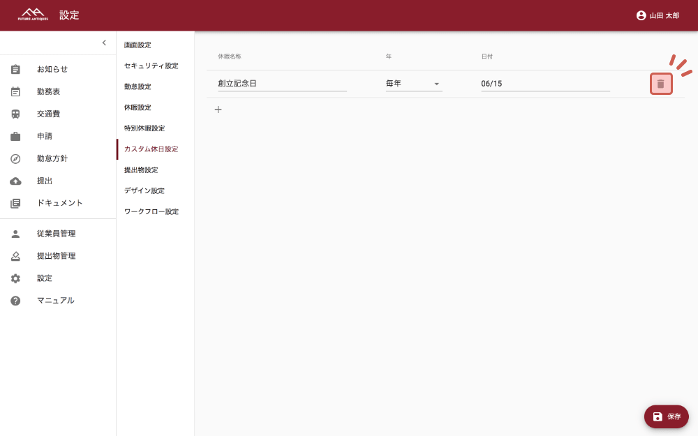 カスタム休日設定 2020.09.292020.11.13 創立記念日など特定の日にちの休暇を作成することができます。夏季休暇やリフレッシュ休暇など、社内独自の休暇を作成する場合には、こちらをご覧ください。 操作手順 会社休日の作成会社休日の削除 会社休日の作成 カスタム休日設定ページにアクセス 左のメニューバーより「設定」をクリックし、設定一覧の中から「カスタム休日設定」をクリックします。 休暇追加 「+」をクリックします。 休暇の編集 「休暇名称」「対象年」「日付」を入力します。 休暇の保存 設定が完了したら、右下の「保存」をクリックします。 会社休日の削除 対象の休暇の日付横にある「ゴミ箱アイコン」をクリックしてください。