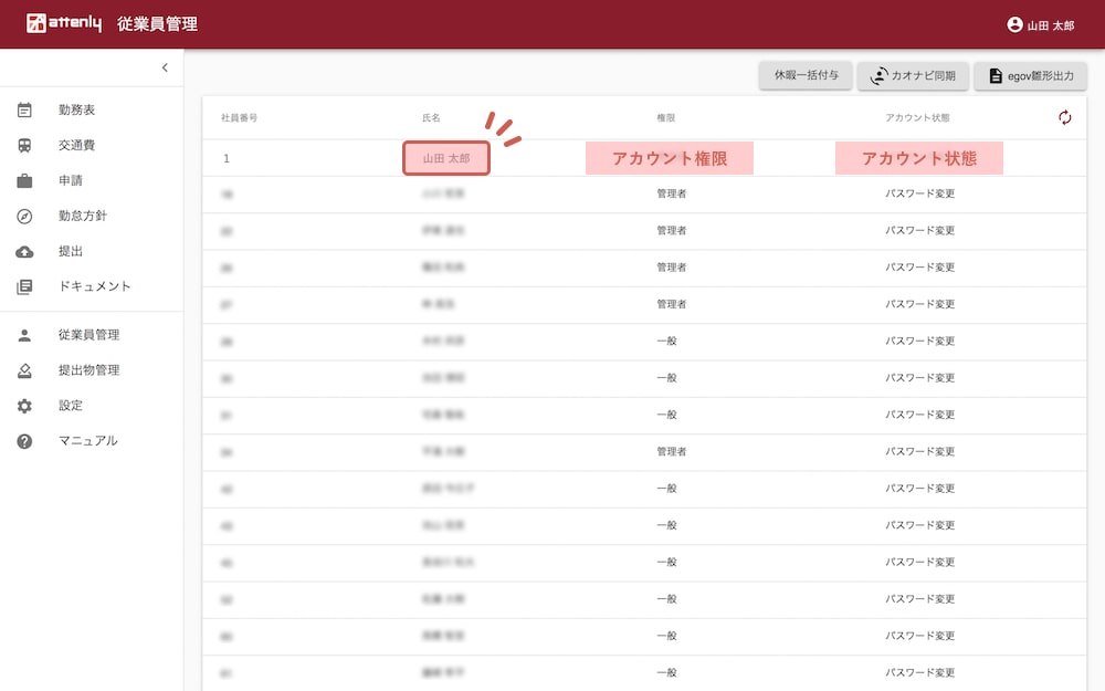 従業員管理では社員番号・氏名・権限・アカウント状態などの「確認」「変更」ができます。