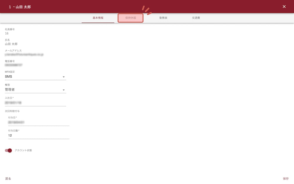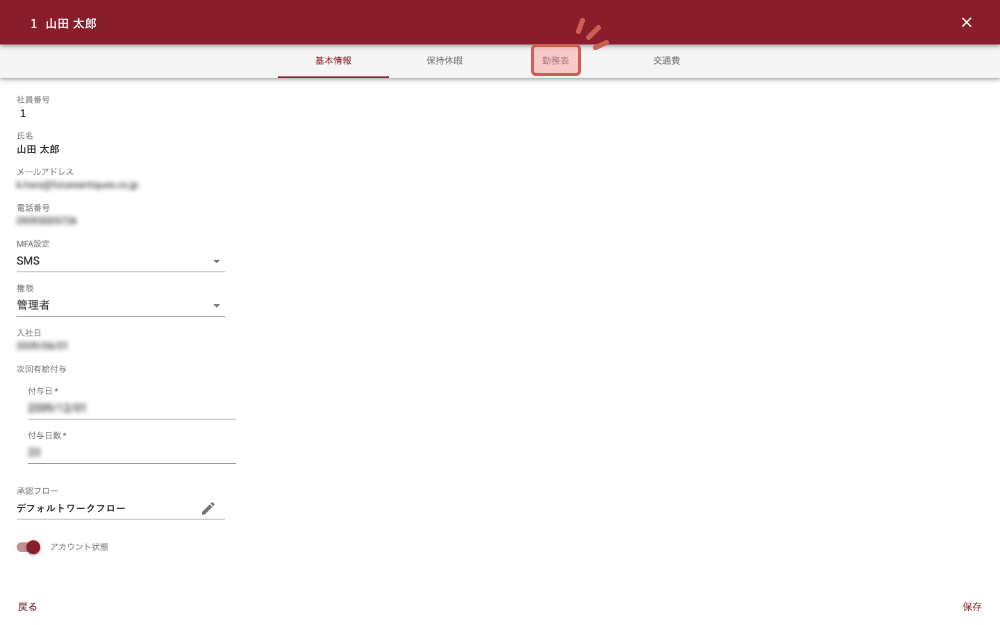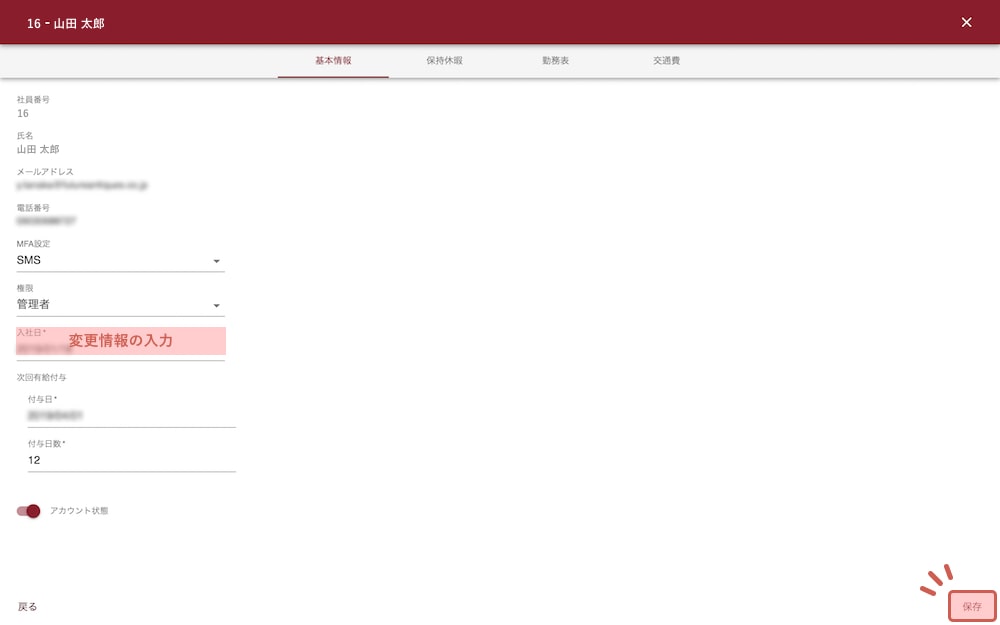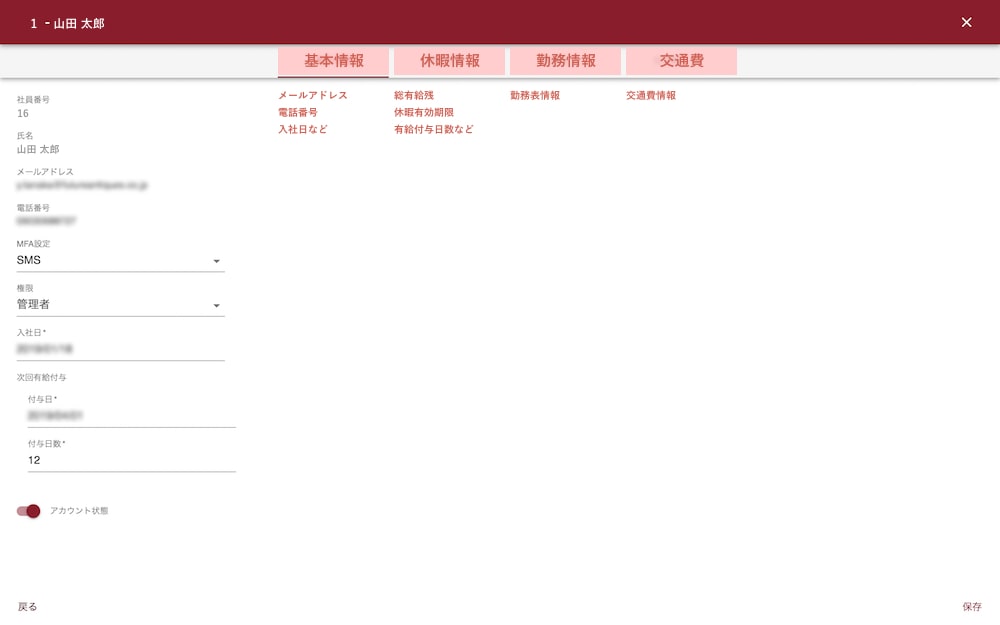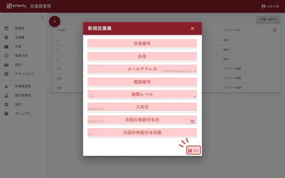 表示ダイアログに沿って「社員番号」「氏名」「メールアドレス」「携帯電話番号」「権限レベル」「入社日」「次回有給付与日」「次回有給付与日数」を入力します。情報の保存