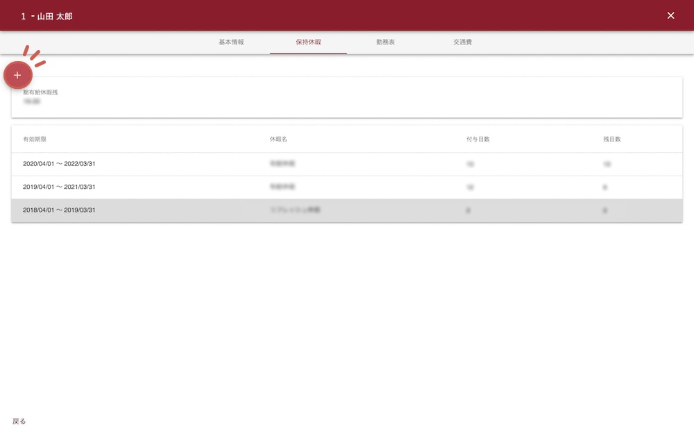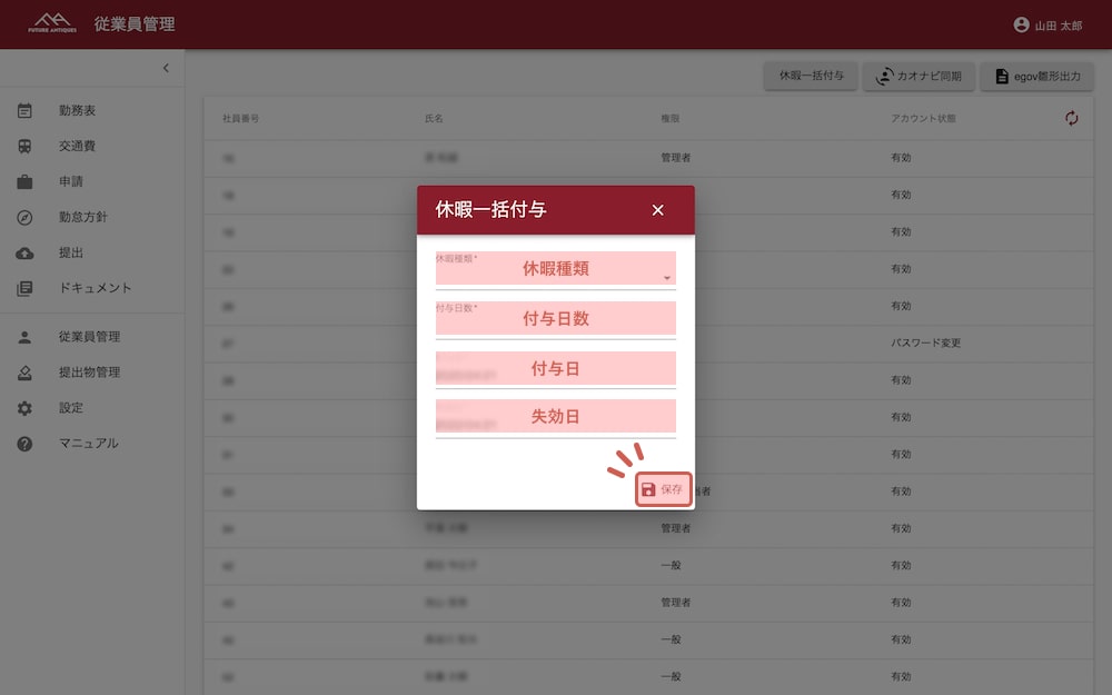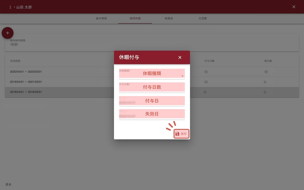 表示ダイアログに沿って「休暇種類」「付与日数」「付与日」「失効日」を入力します。情報の保存