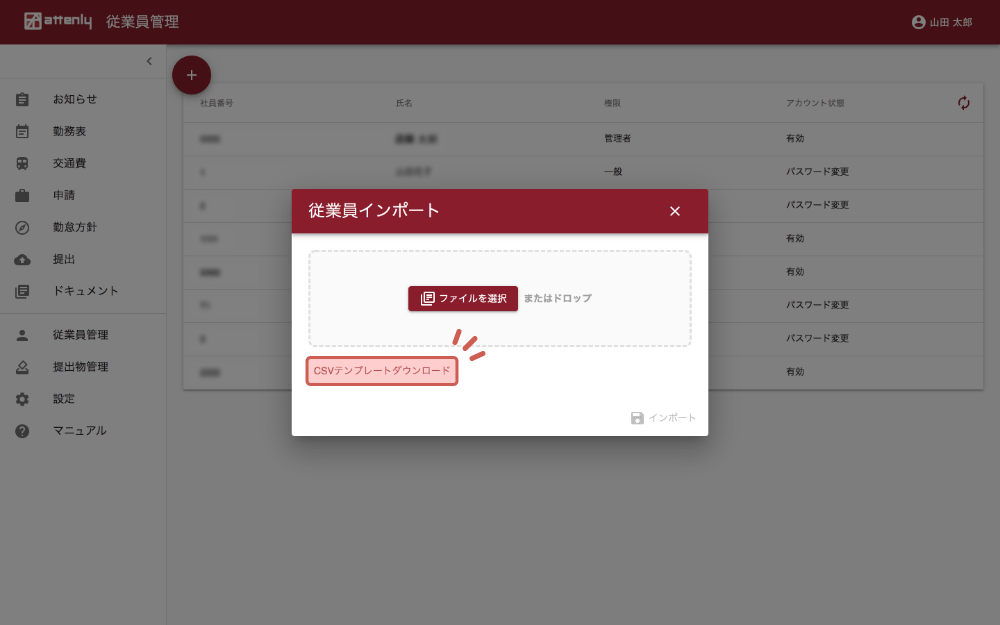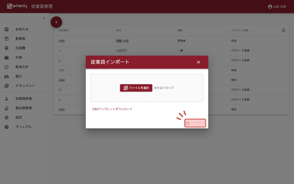 テンプレートが完成したら、「従業員管理」ページにアクセス、「+」をクリックし、「従業員インポート」をクリックします。
