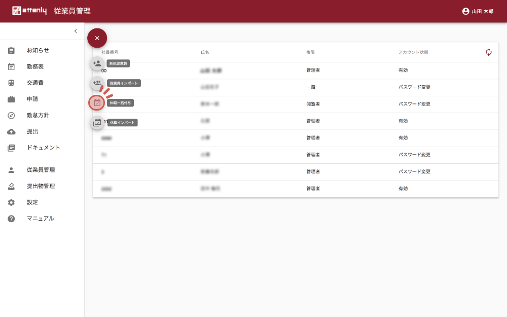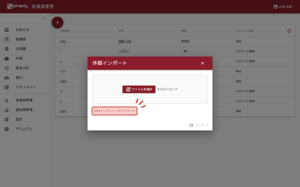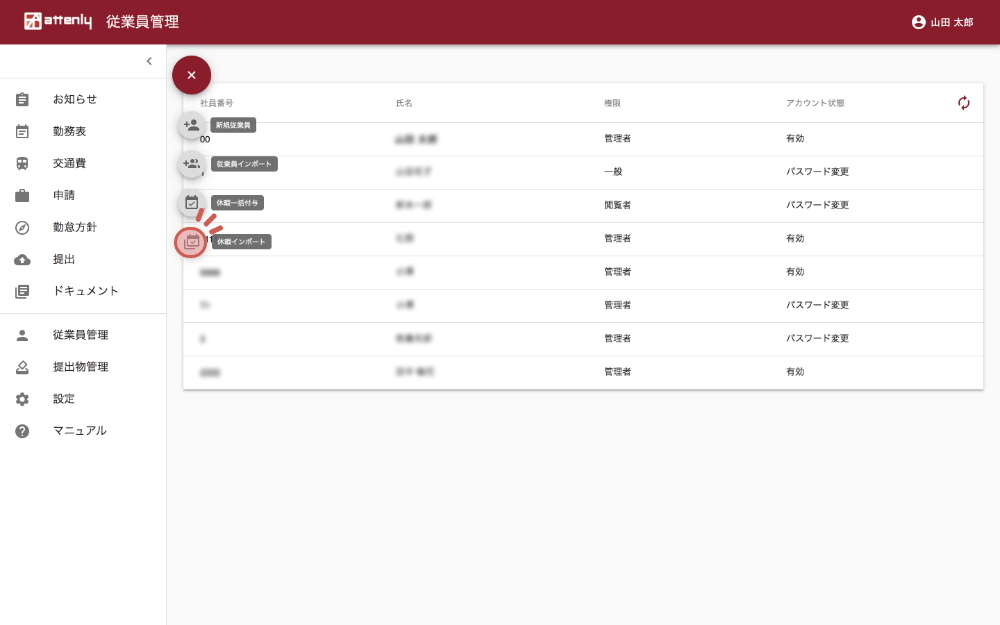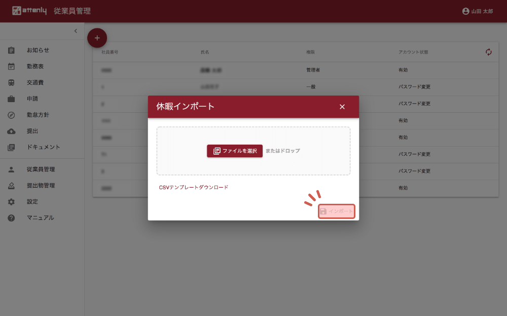 テンプレートが完成したら、「従業員管理」ページにアクセス、「+」をクリックし、「休暇インポート」をクリックします。