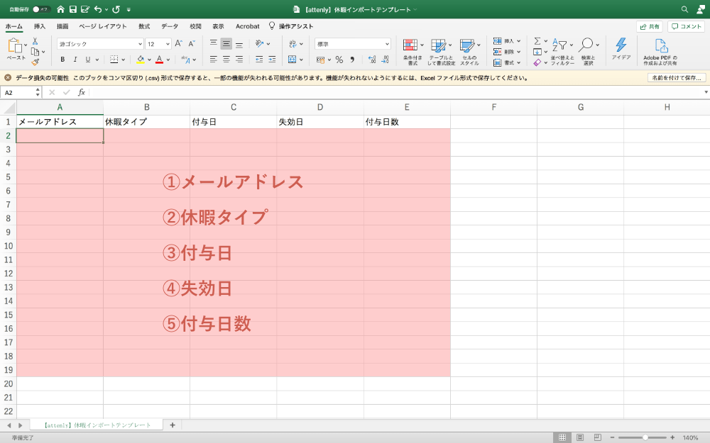 「メールアドレス」「休暇タイプ」「付与日」「失効日」「付与日数」を入力し、保存します。日付の項目は文字列に変更してから入力します。付与日、失効日については「YYYY/MM/DD」形式(例:2020/04/01)で入力してください。