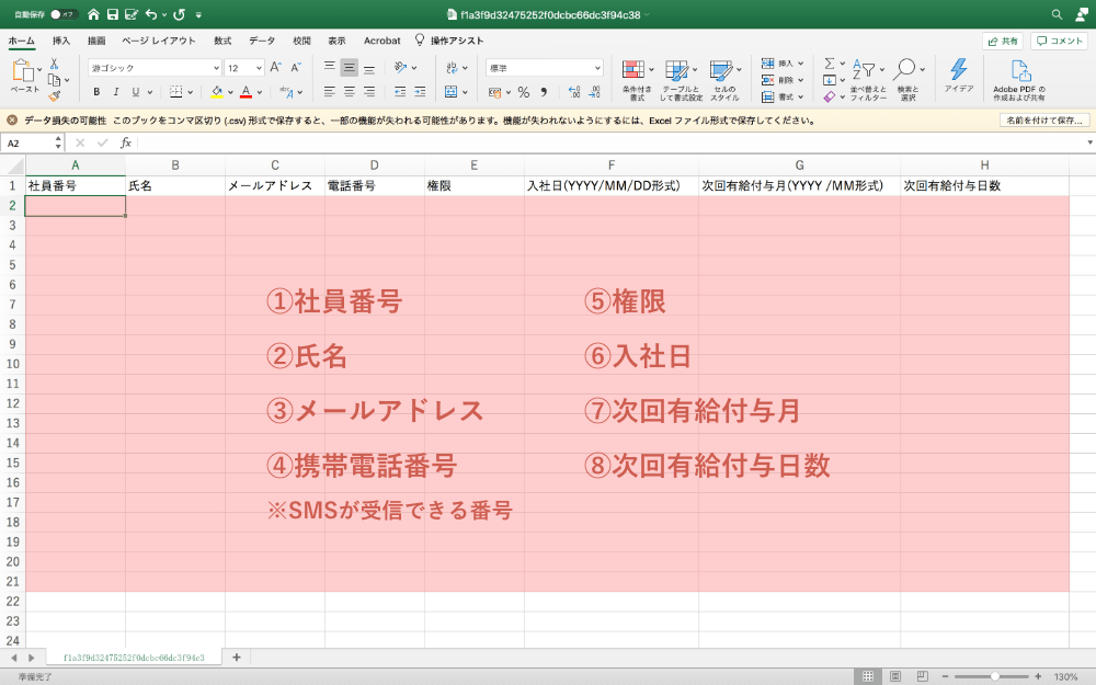 「社員番号」「氏名」「アドレス」「携帯電話番号」「権限」「入社日」「次回有給付与月」「次回有給付与日数」を入力し、保存します。日付の項目は文字列に変更してから入力します。入社日については「YYYY/MM/DD」形式(例:2020/04/01)、次回有給付与月については「YYYY/MM」(例:2020/09)で入力してください。