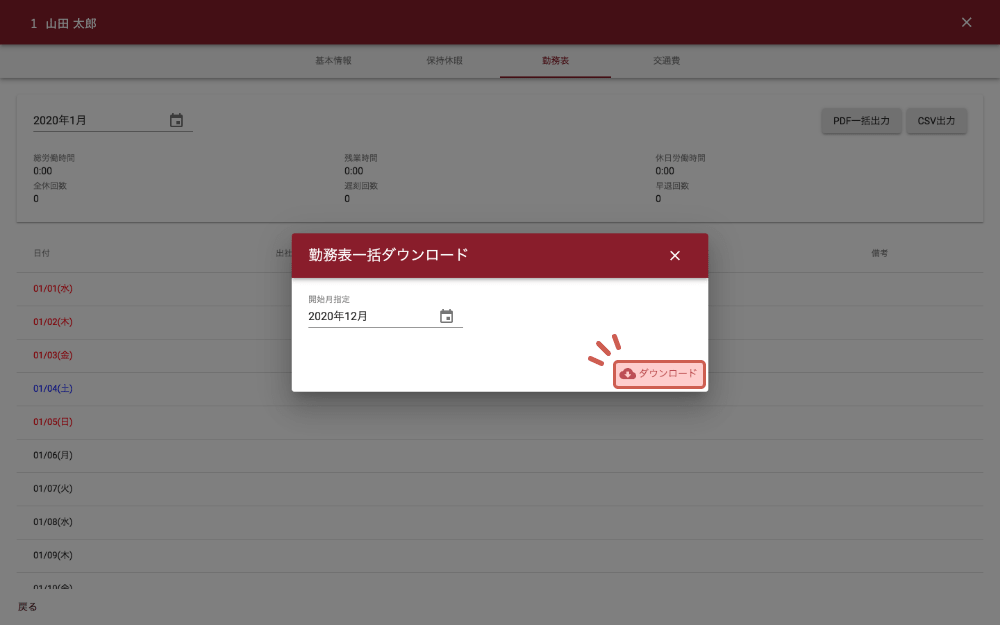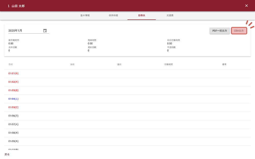 入力が完了したら画面右下の「保存」をクリックます。従業員の勤怠データ出力