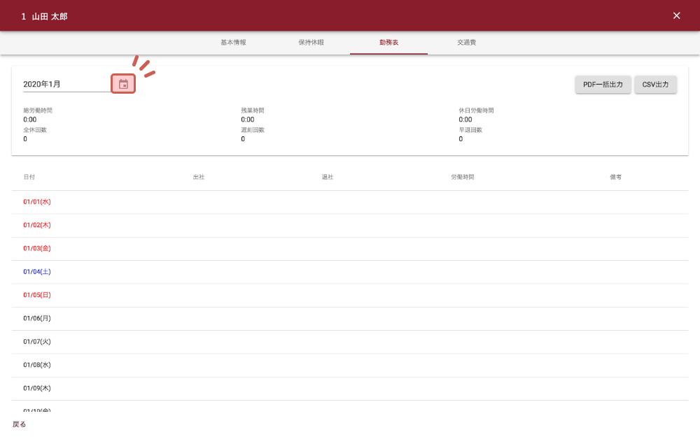 CSVで出力したい場合は、勤務表ページの左上のカレンダーをクリックし、出力したい月を選択します。