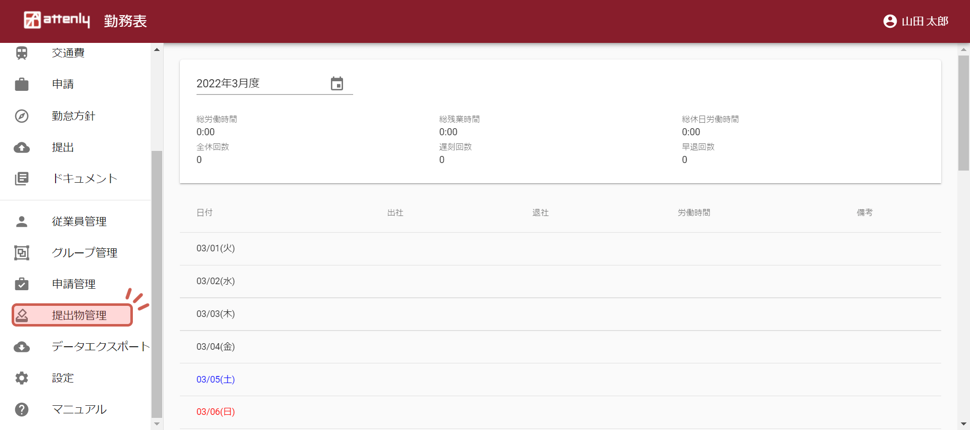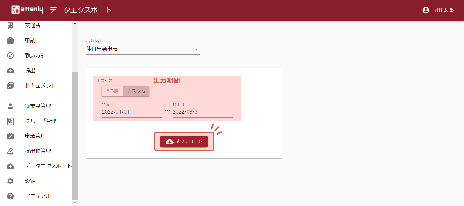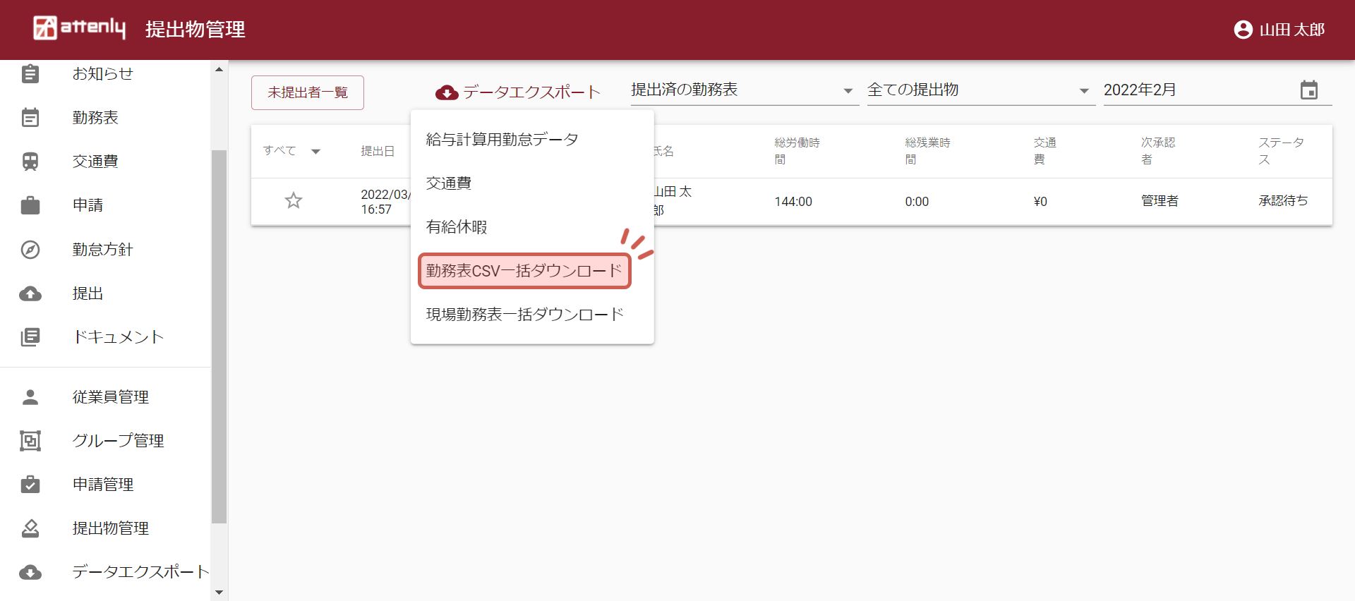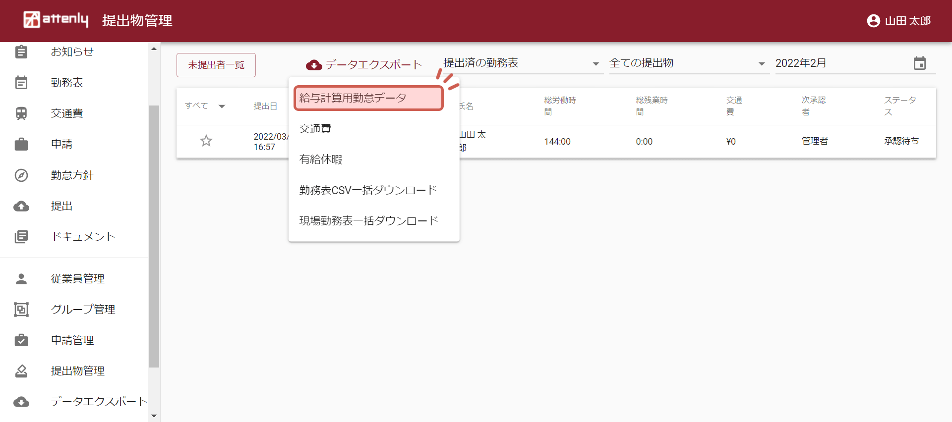 また、勤務表以外の提出物を設定している場合「提出物データ」のエクスポートも可能です。