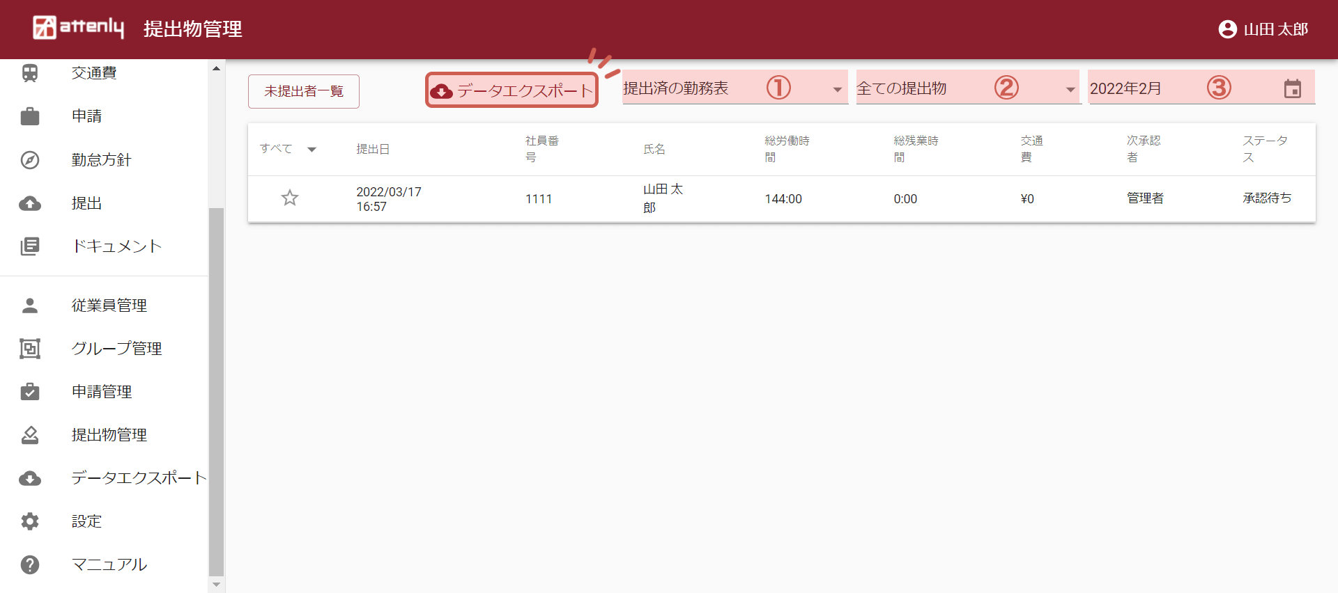 画面右上の①提出済みの勤務表 ②すべての提出物 ③対象の年月を選択し、「データエクスポート」をクリックします。
