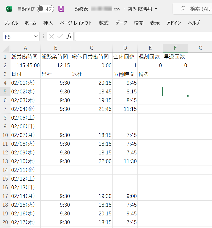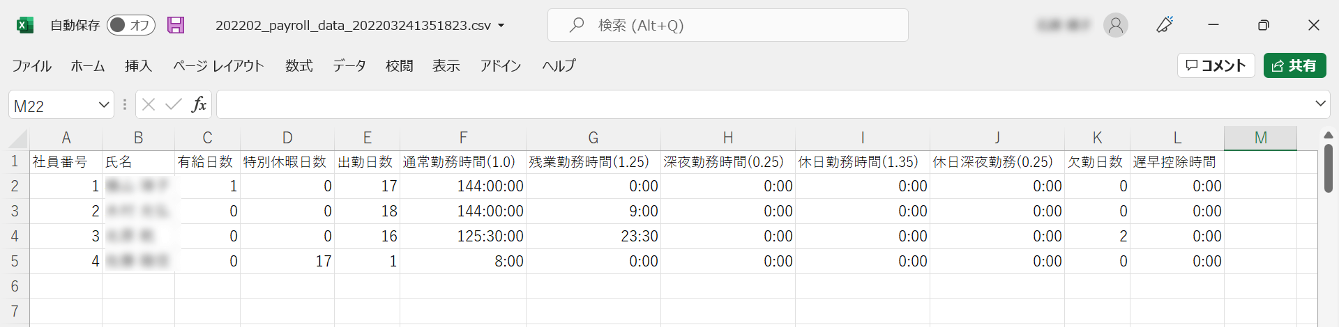 有給取得日数・出勤日数・通常勤務時間・残業勤務時間・深夜勤務時間・休日勤務時間・休日深夜勤務・欠勤日数・遅早駆除時間が一覧で見られるCSVデータになります。