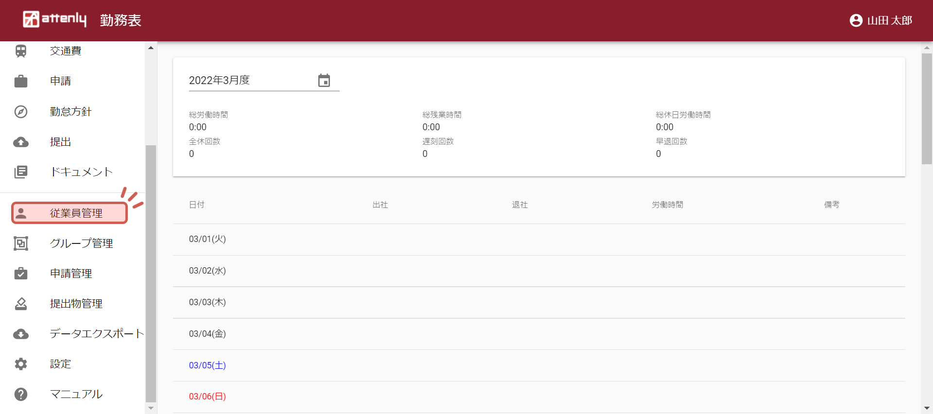 社員ごとに総労働時間・総残業時間・総休日労働時間・全休回数・遅刻/早退回数と毎日の出退勤の時間を確認することが可能です。