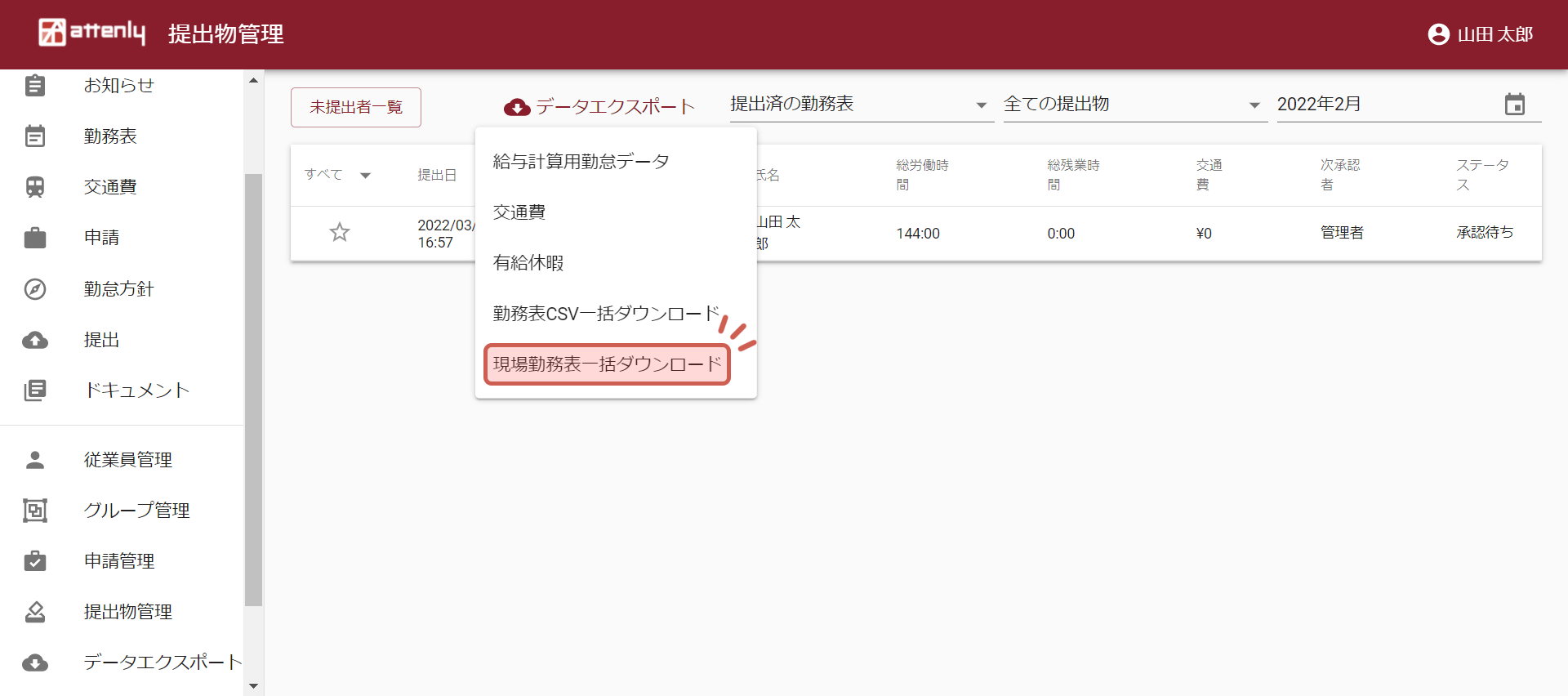提出物の名称を「現場勤務表」としていた場合は「現場勤務表一括ダウンロード」と表示されます。