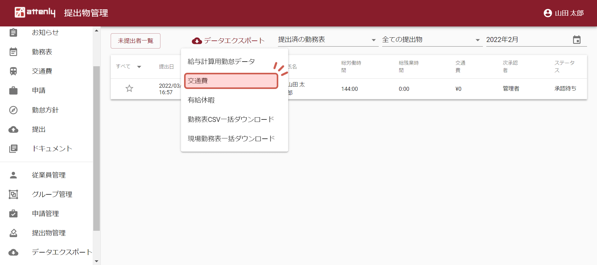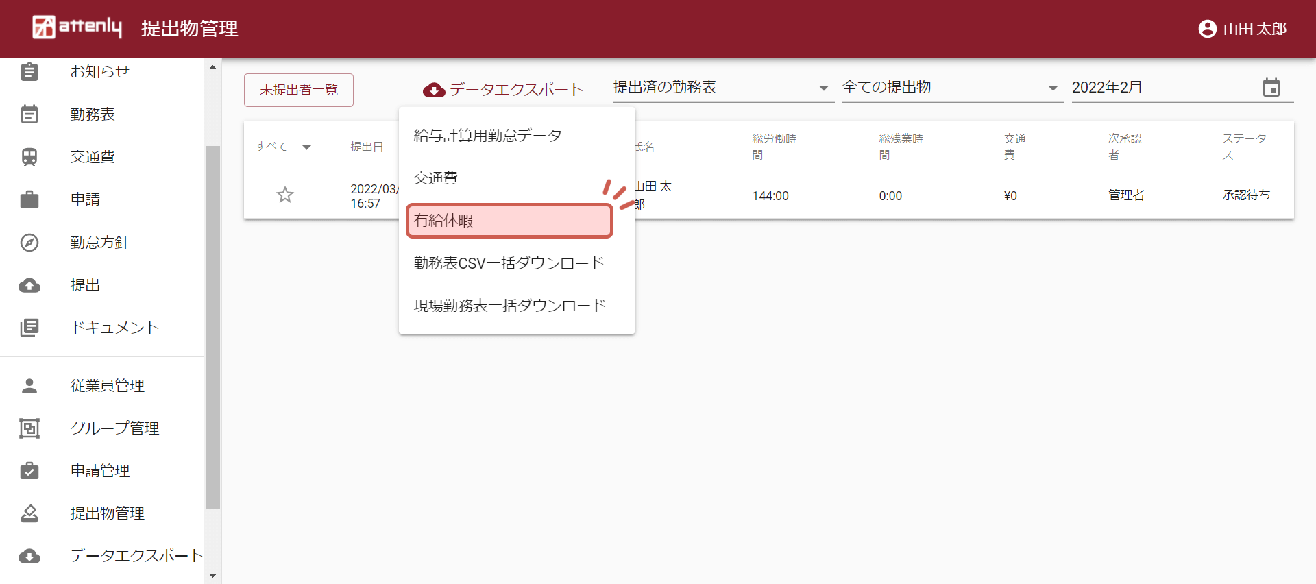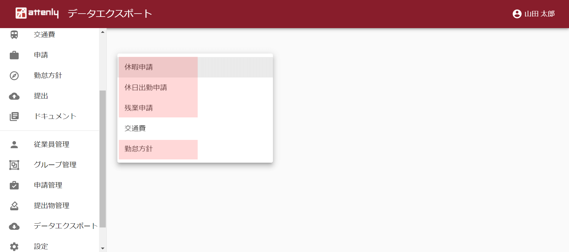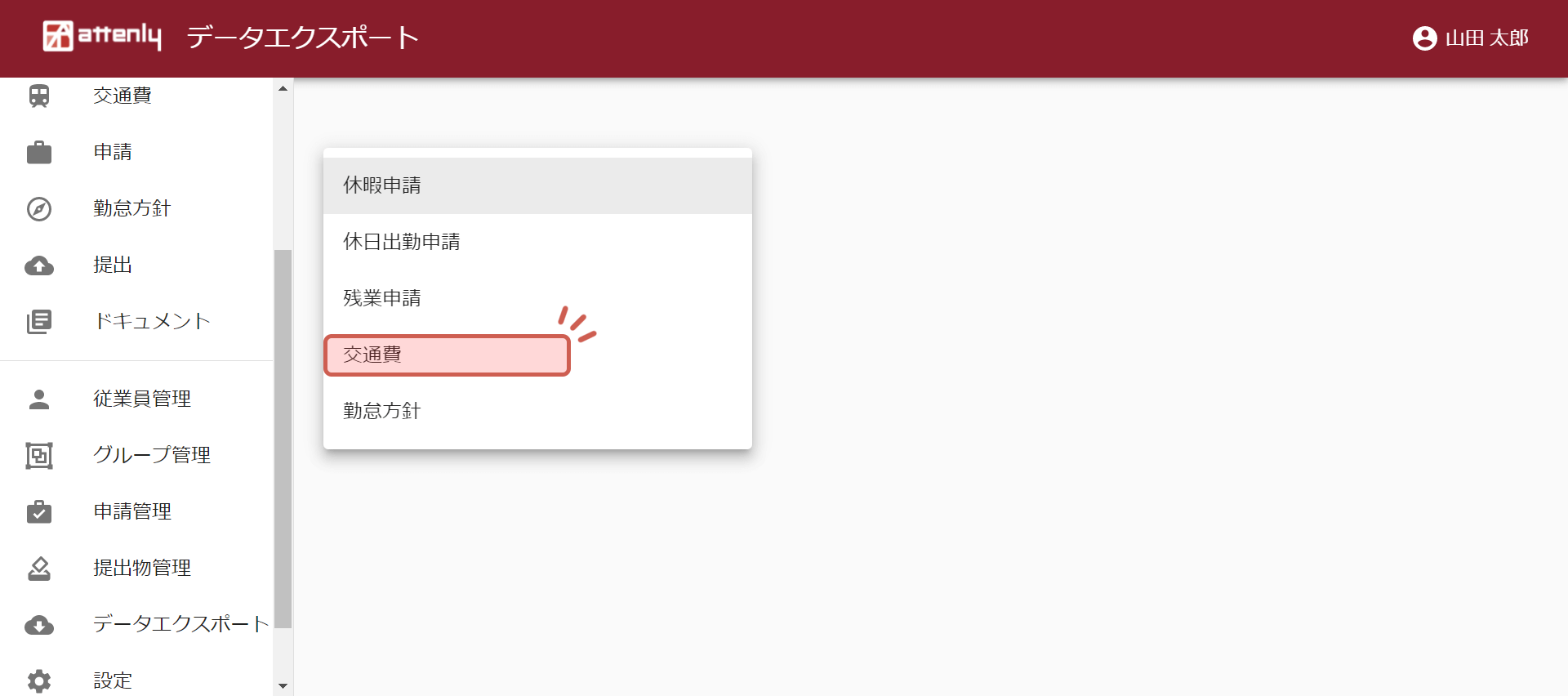 エクスポート機能では、「給与計算用勤怠データ」「交通費」「有給休暇」の他、