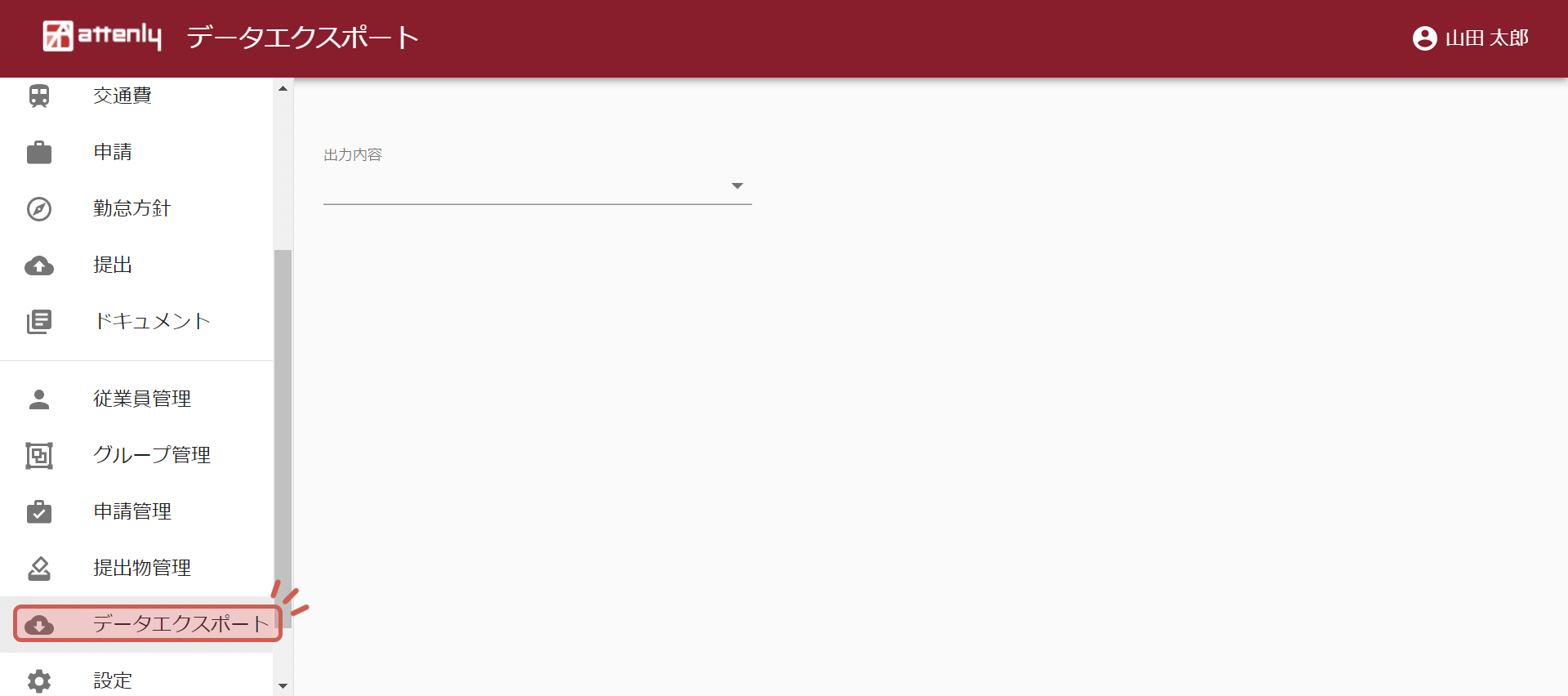 「勤怠情報エクスポート」から、提出物管理から給与計算用勤怠データをエクスポートする項目について設定することができます。
