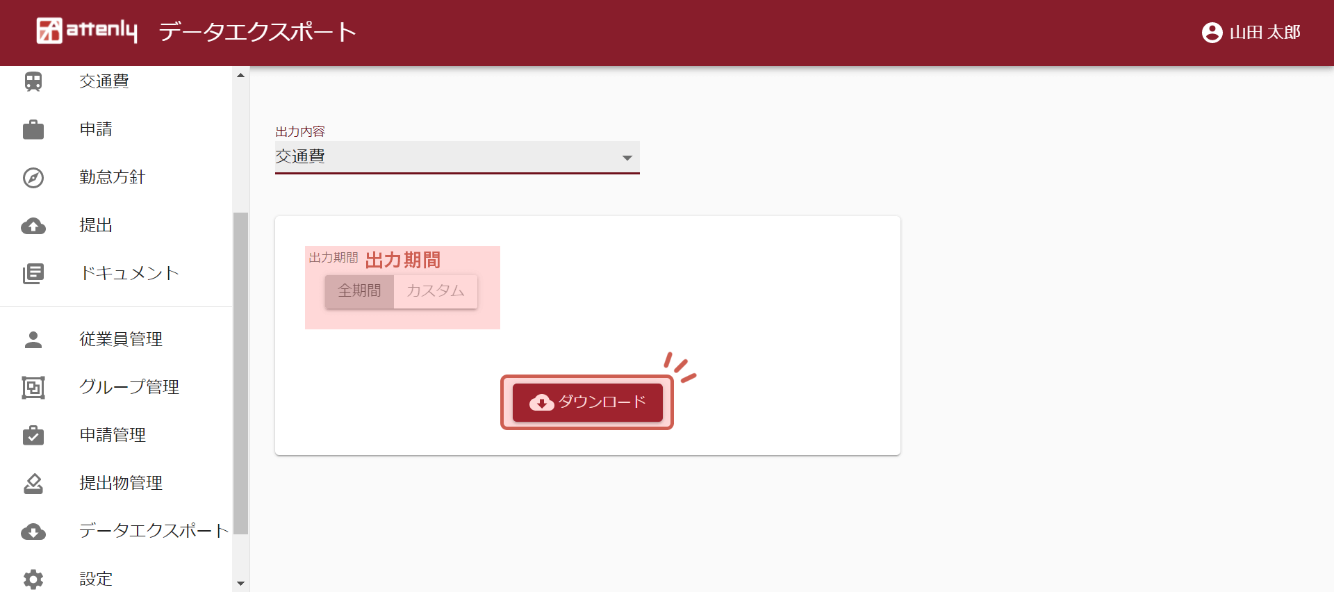 給与計算用勤怠データをエクスポートする項目の編集・交通費の経路/備考のエクスポートについては「エクスポートの項目の編集」をご覧ください。