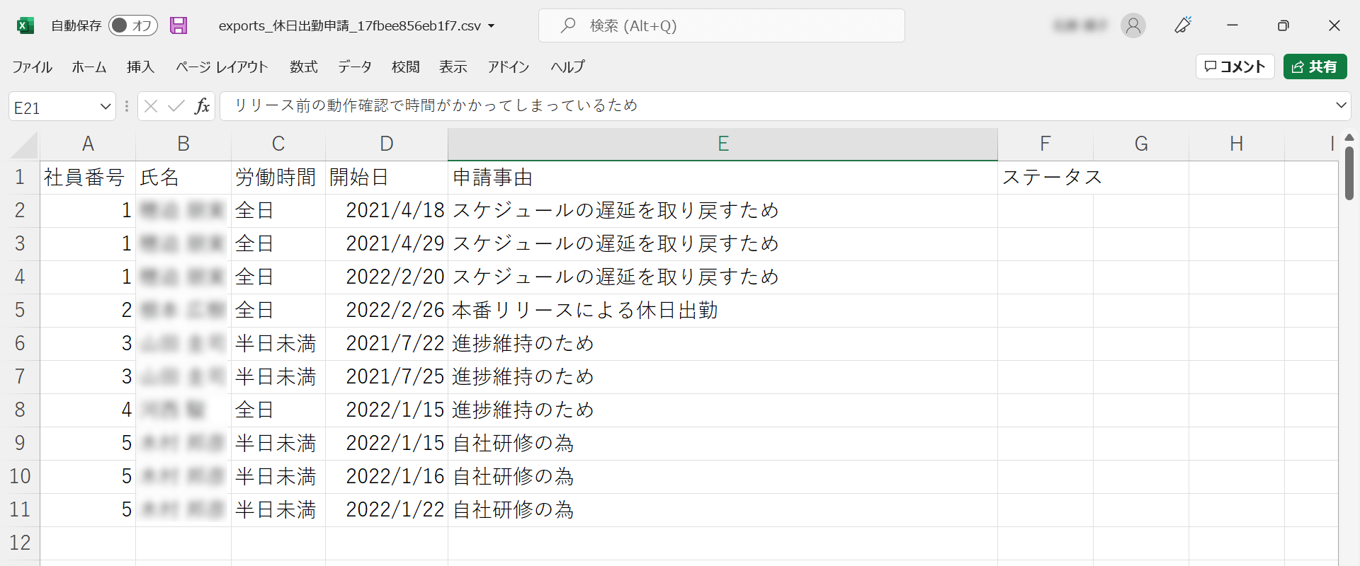 - 休日出勤申請:労働時間・日付・申請事由・ステータス