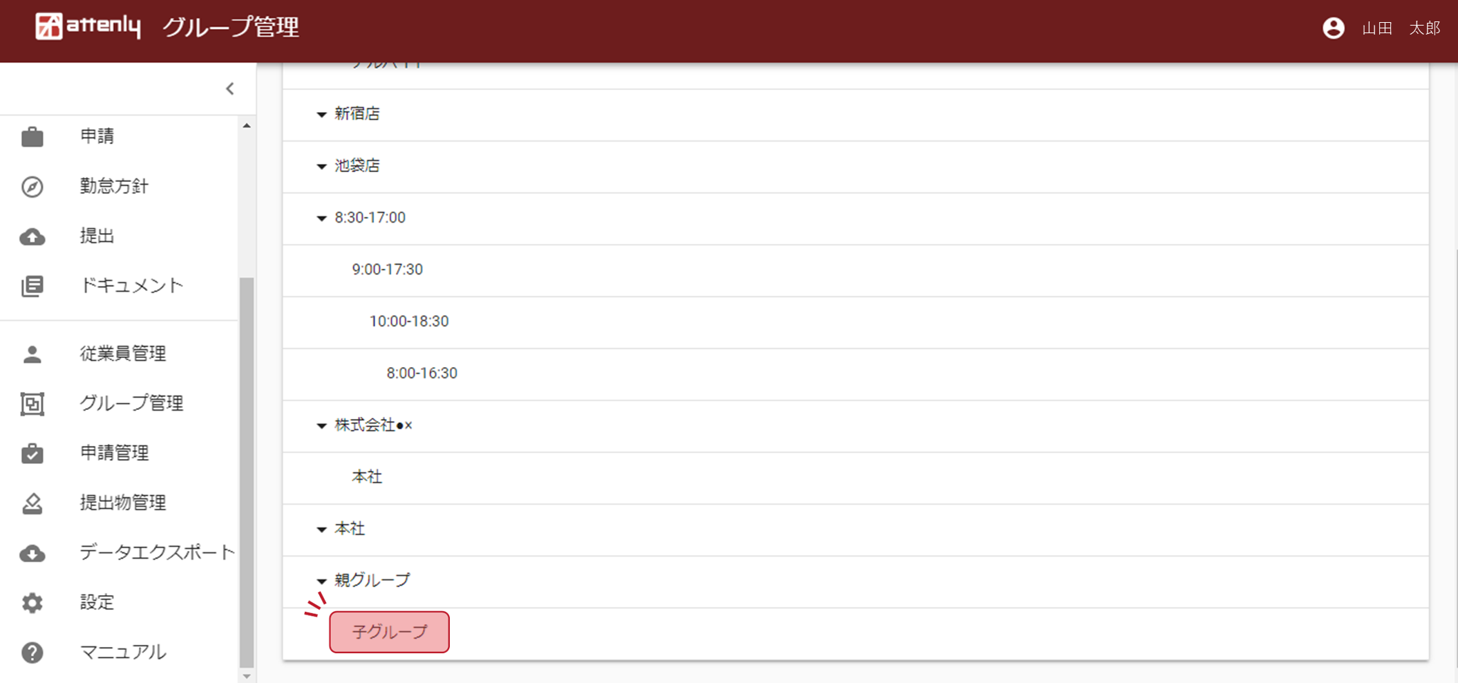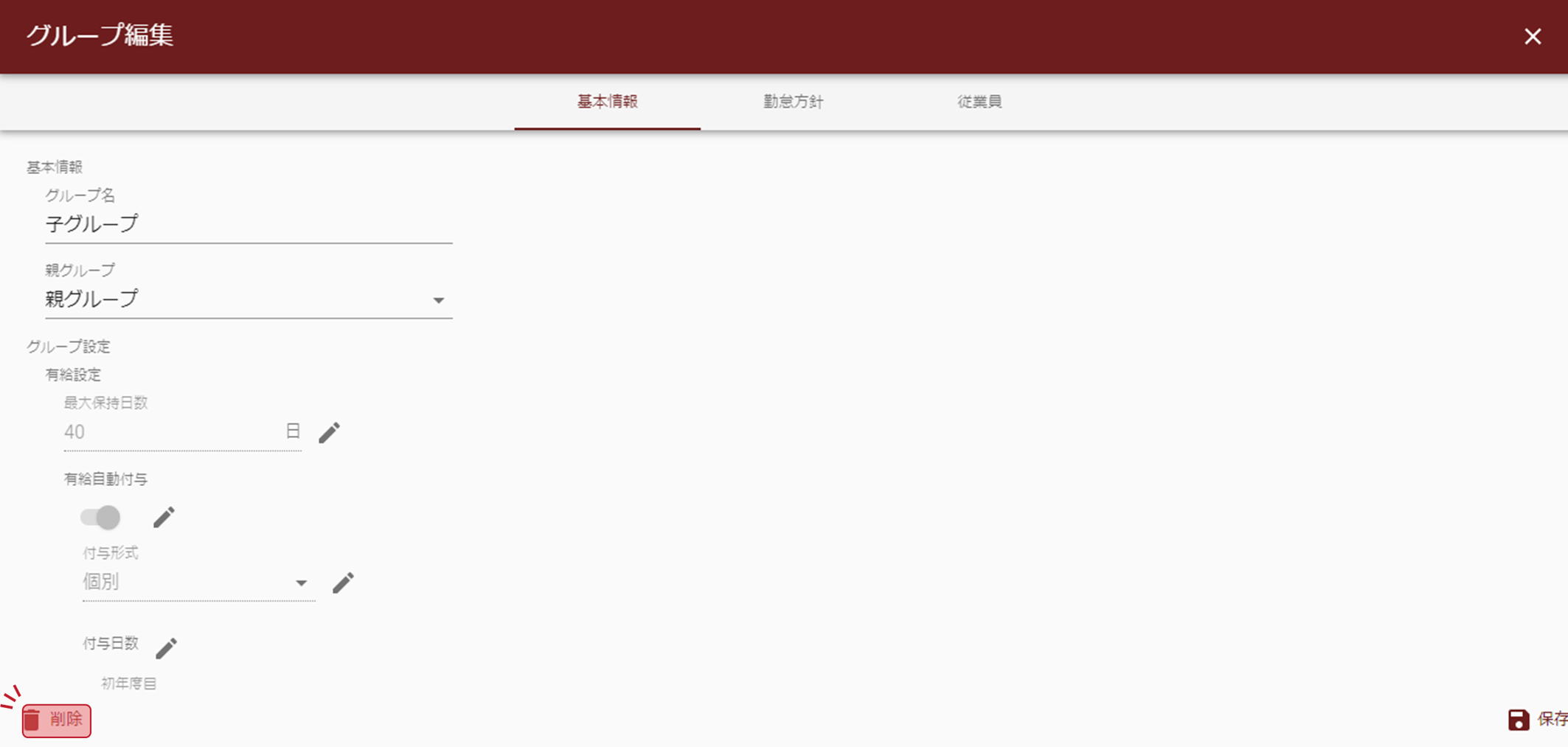 グループごとに共通の勤怠方針を使用する場合に設定が可能です。グループの削除
