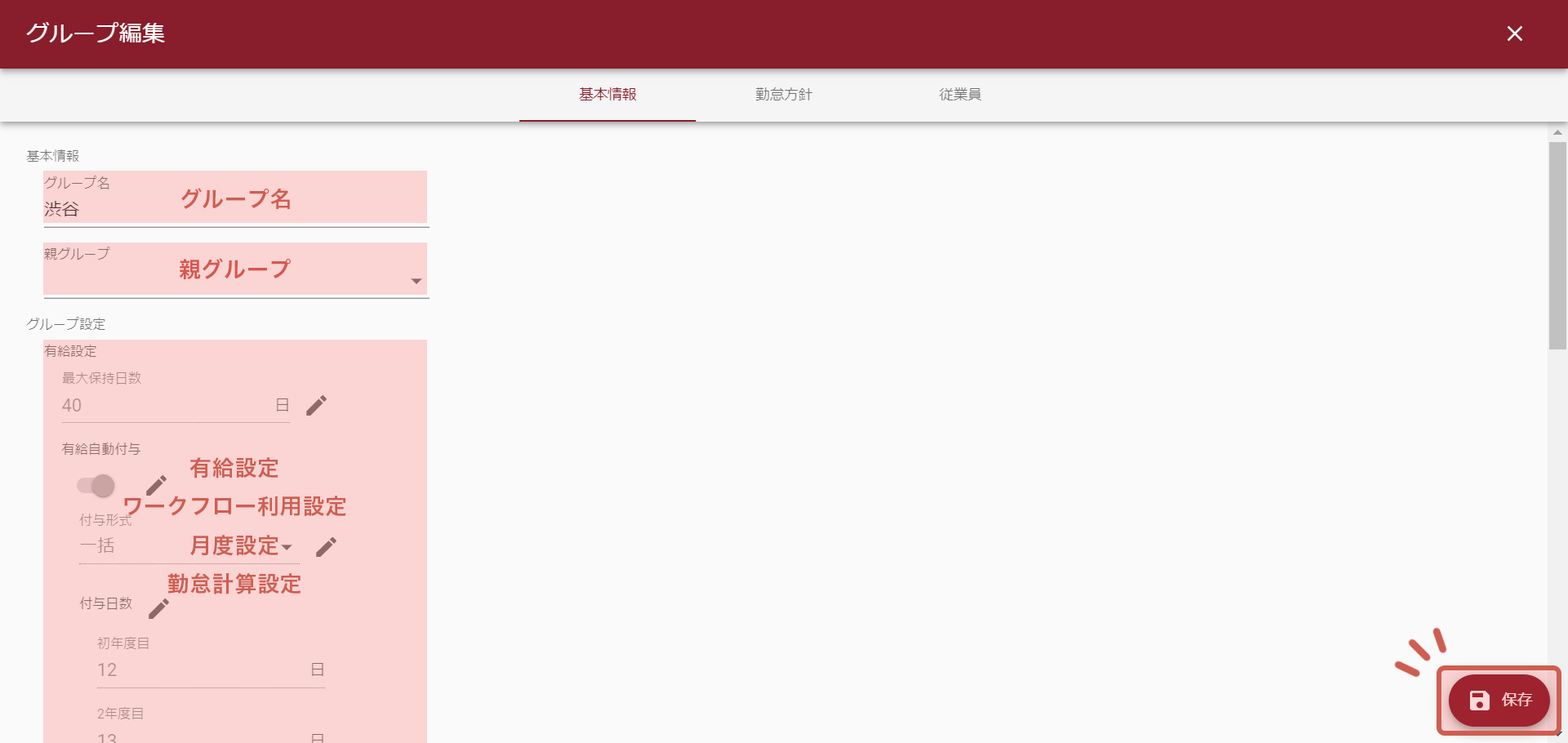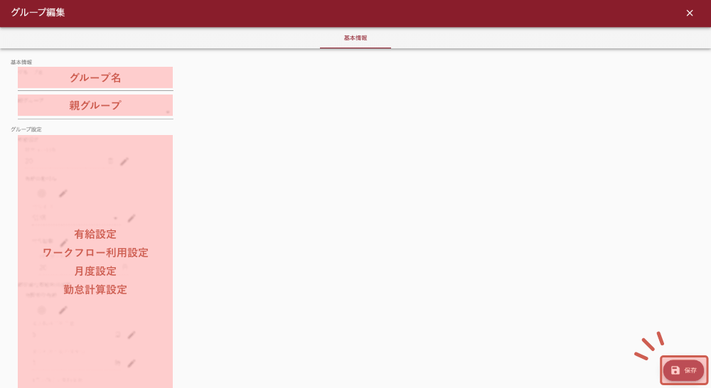グループごとに、締日や勤怠設定を変更することが可能です。情報の保存