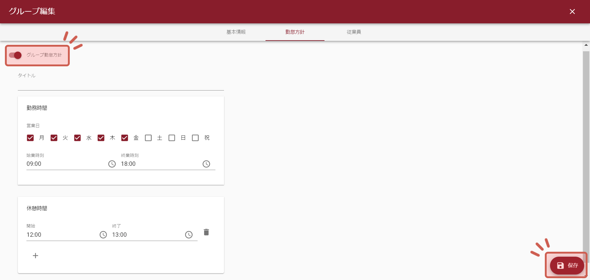 グループ勤怠方針をオンにし、タイトル・勤務時間・休憩時間を入力し、「保存」をクリックします。