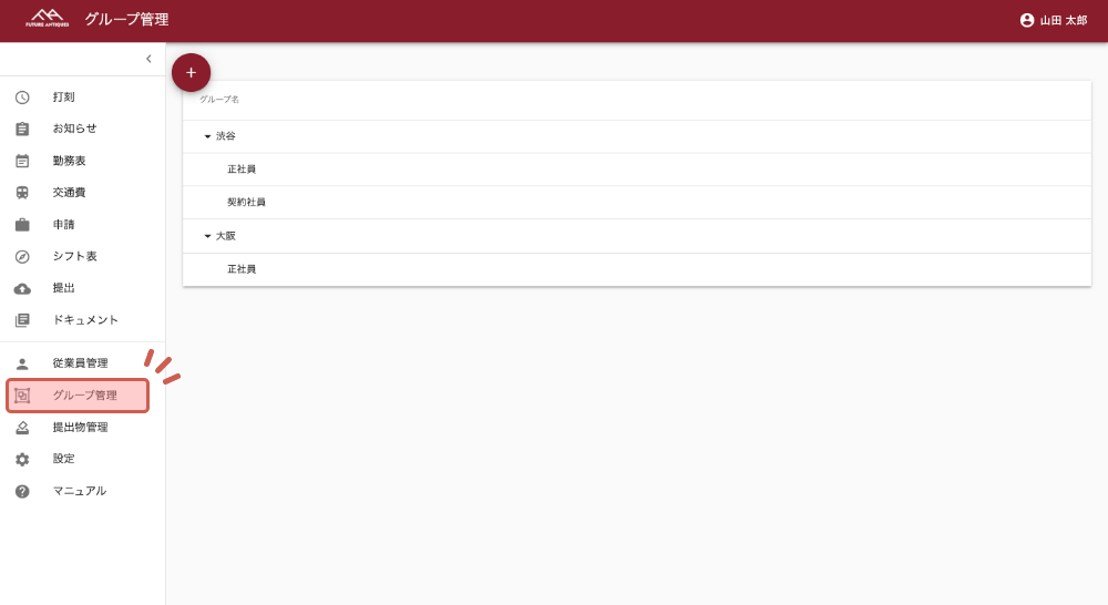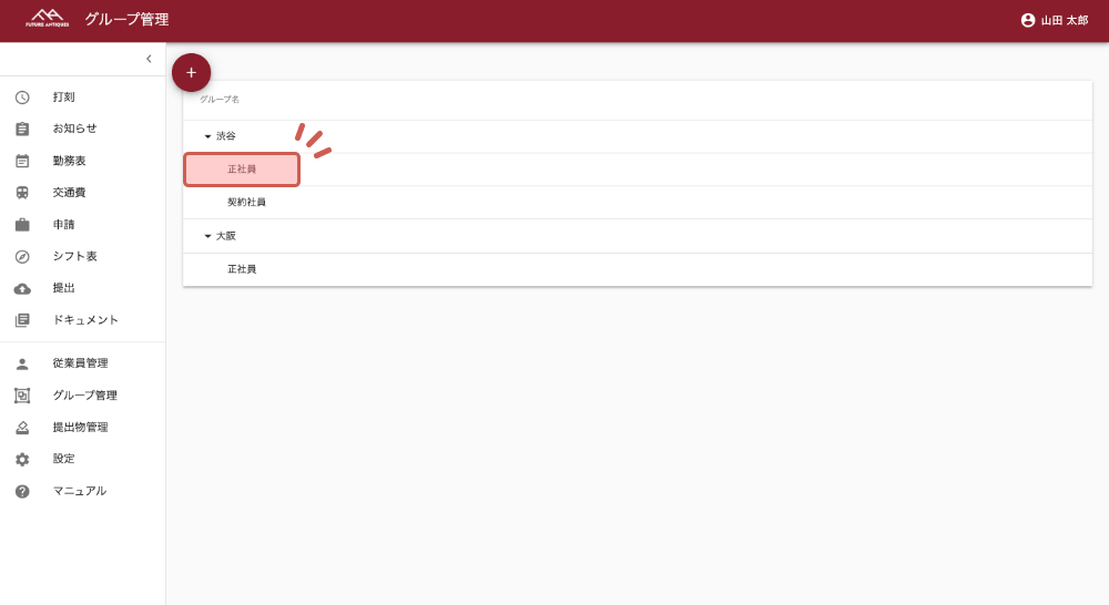 「グループ管理」では、事業所や雇用形態ごとに社員のグループ分けが可能です。設定したグループごとに、有給設定やワークフローなどの変更ができます。