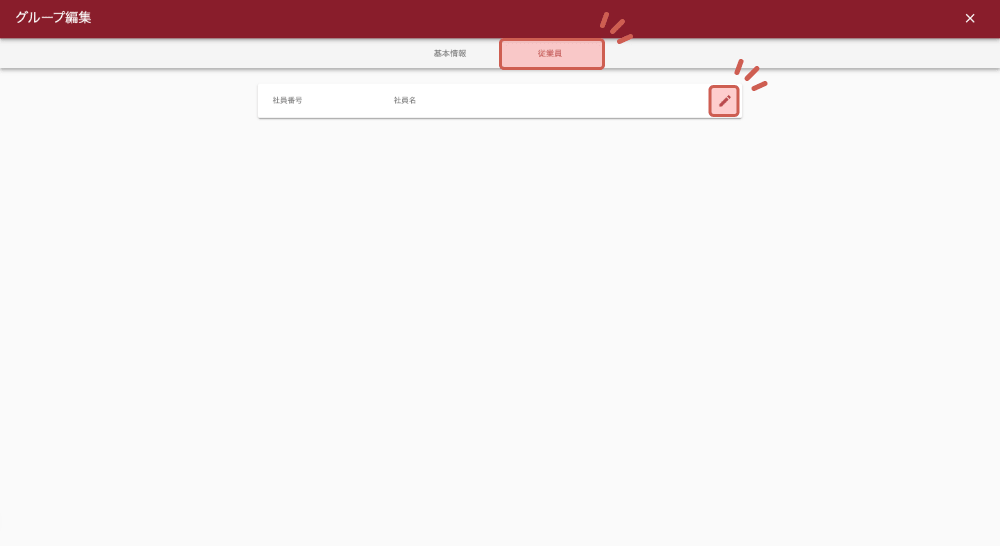 グループ編集タブの中から「従業員」をクリックし、画面右上の編集マークをクリックします。