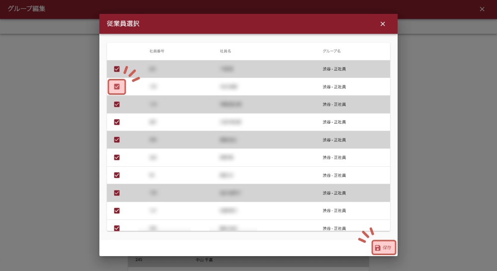 従業員一覧が表示されるので、追加の場合はグループに追加したい社員をチェックします。削除の場合はチェックを外します。情報の保存