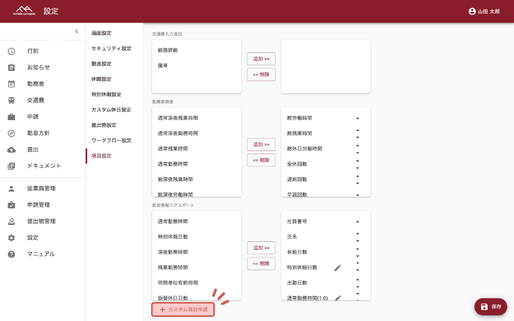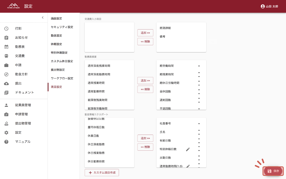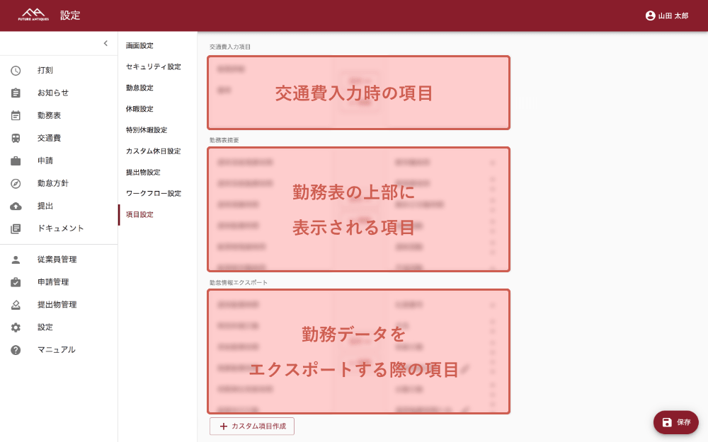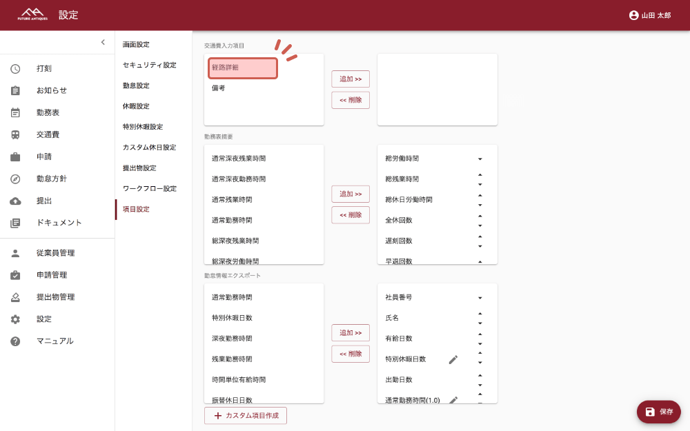 「項目設定」では、交通費入力時の項目をはじめ、勤務表ページでの表示項目、エクスポート時の抽出項目を設定することが可能です。