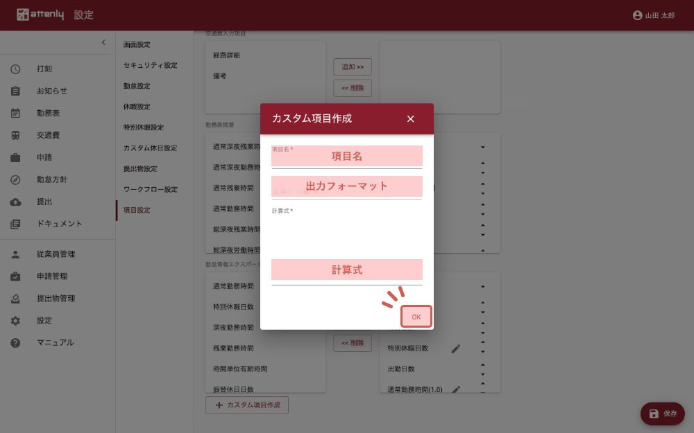 「項目名」と「出力フォーマット」と「計算式」を入力し「OK」をクリックします。 出力フォーマットは文字や数値は「文字・数値」、時間であれば「時分」を選択します。 計算式では ・四則演算 ・3項演算子 ・比較演算子(<,>,==のみ) を使用することができます。