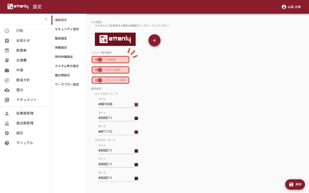 メニュー表示設定の「ドキュメント画面」「お知らせ画面」「打刻」をクリックして表示/非表示を切り替えます。
