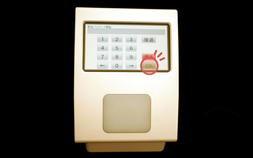 設定パスワードを入力し、「OK」をタッチします。初期設定値は「0000」になっています。