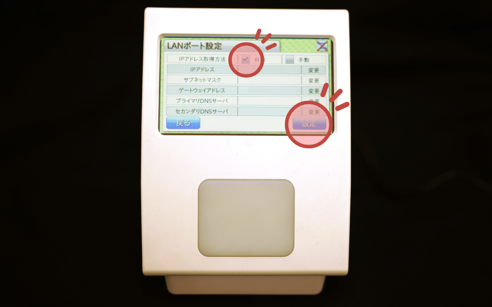 IPアドレス取得方法を「自動」に選択し、「設定」をタッチします。右上のマークに「×」がついた状態から、「×」がなくなっていれば設定完了です。また、IPアドレス取得方法を「手動」に選択して、IPアドレスなどを手入力して設定することも可能です。