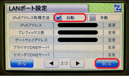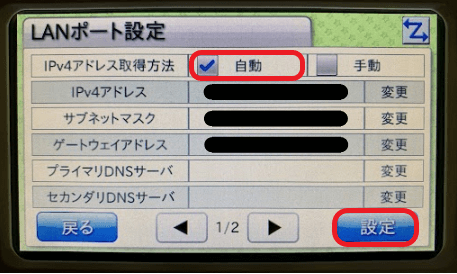 「IPアドレス取得方法」の「自動」にチェックを入れて「設定」を押します。