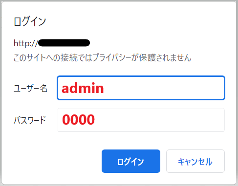 ユーザー名に「admin」、パスワードに「0000」を入力しログインします。