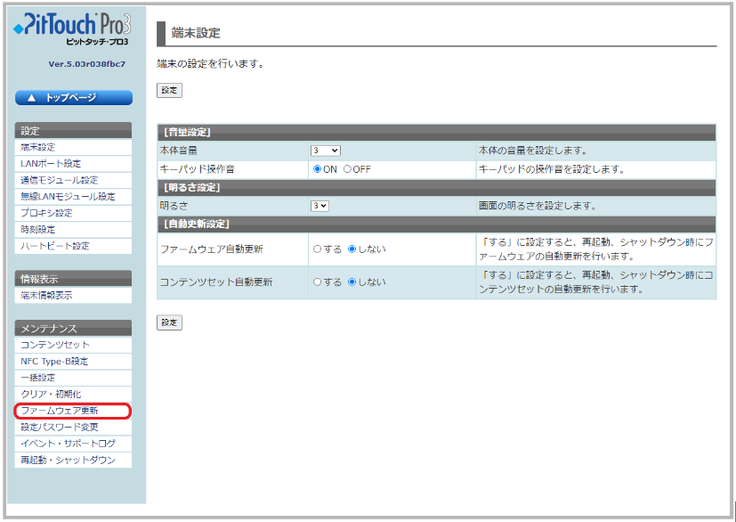 「メンテナンス」>「ファームウェア更新」を選択します。