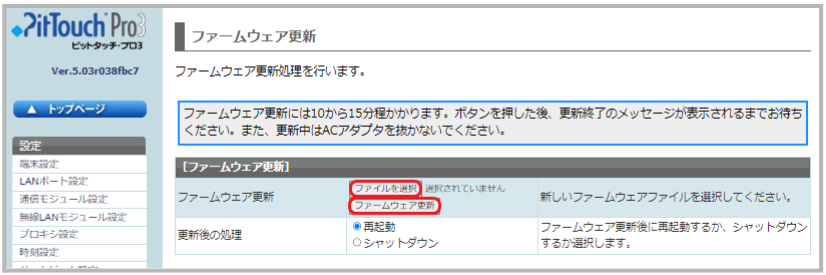 「ファイルを選択」をクリックして、【pro#_#(ファームウェアバージョン)#.pkg】ファイルを選択し、「ファームウェア更新」をクリックします。