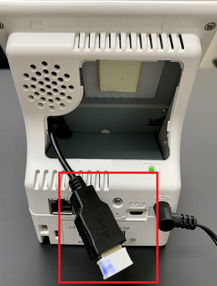 本体後ろにLANケーブルを接続し、本体を起動した状態で、側面にある「電源ボタン」を長押しします。(2~3秒ほど)