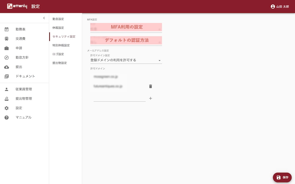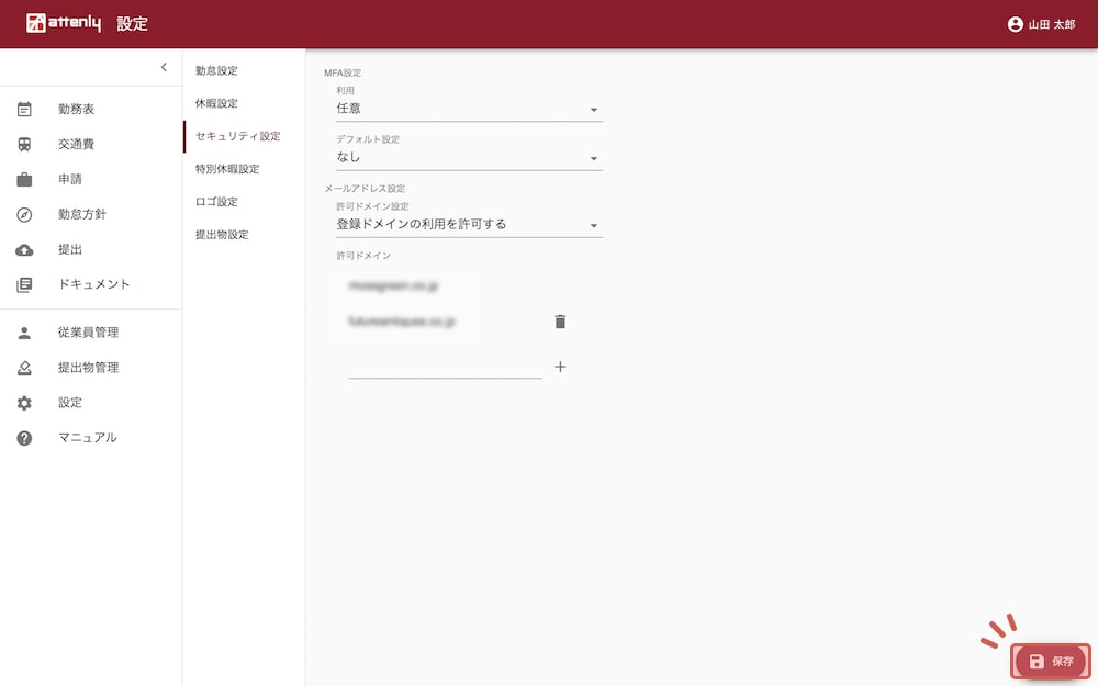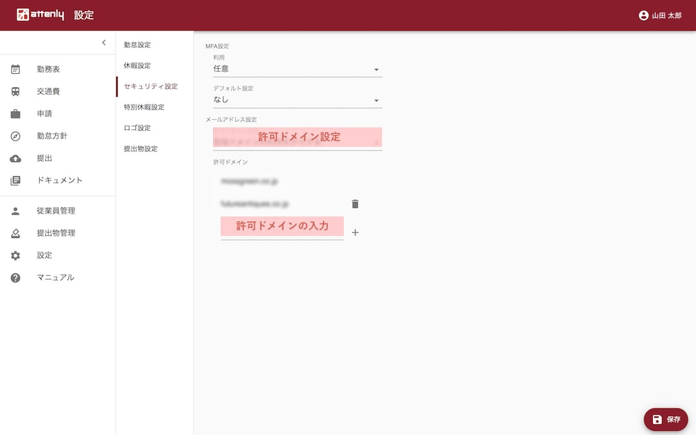 従業員登録時のメールアドレスで許可するドメインの設定です。