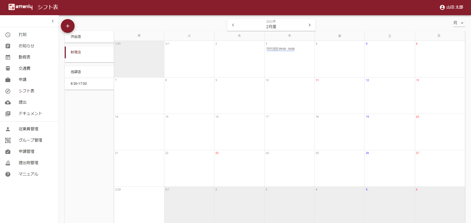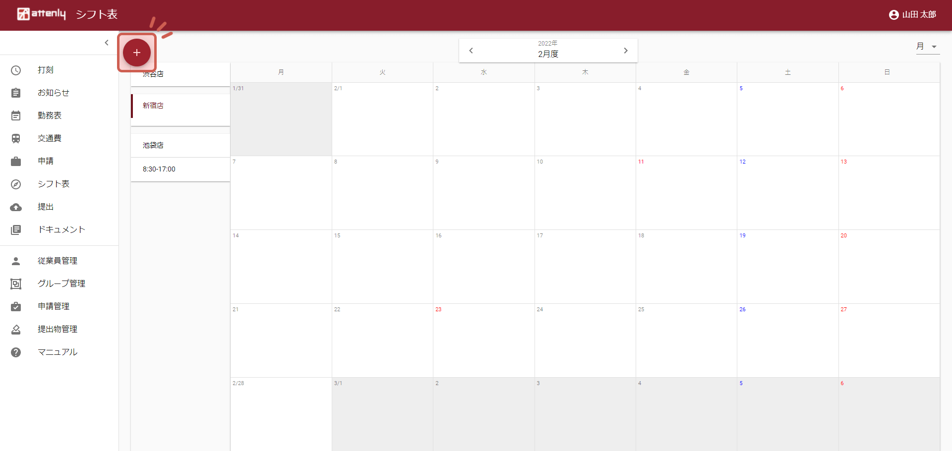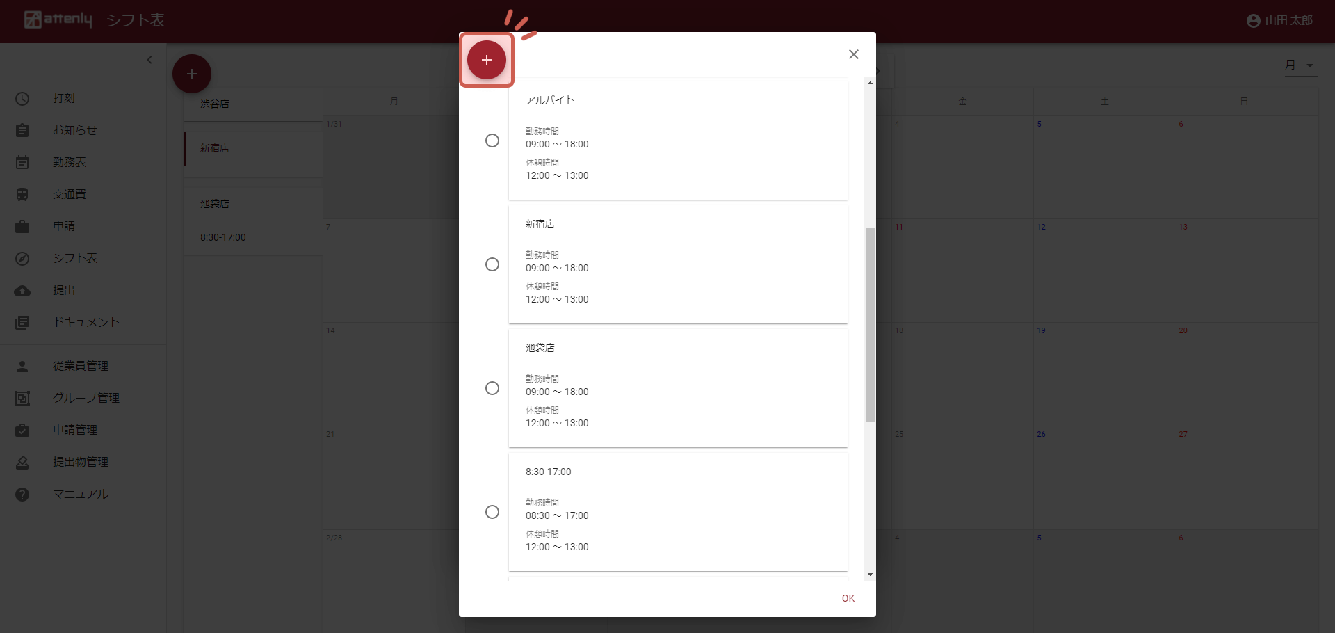 左上の「+」をクリックし、新規シフトを作成します。