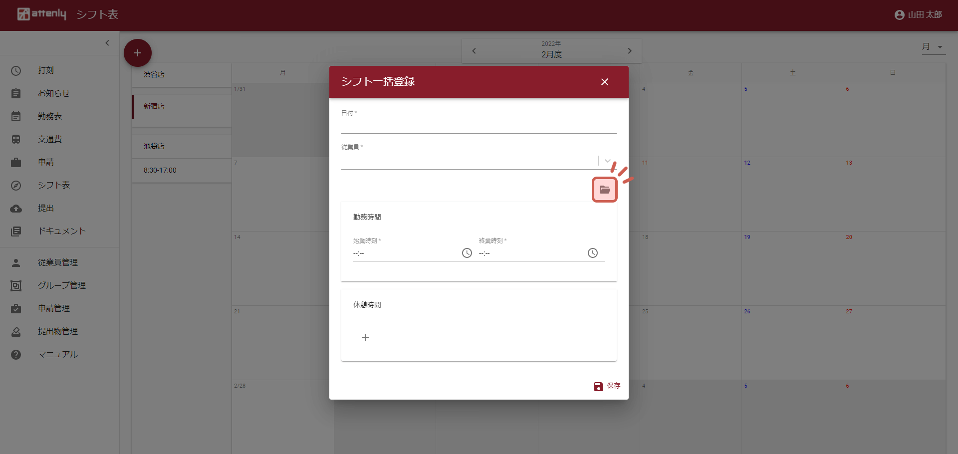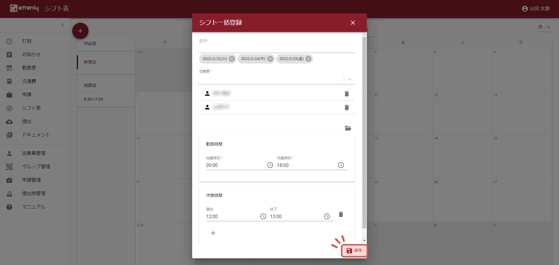 登録したい日付(複数日選択可)、従業員(複数人選択可)を登録し「保存」をクリックします。