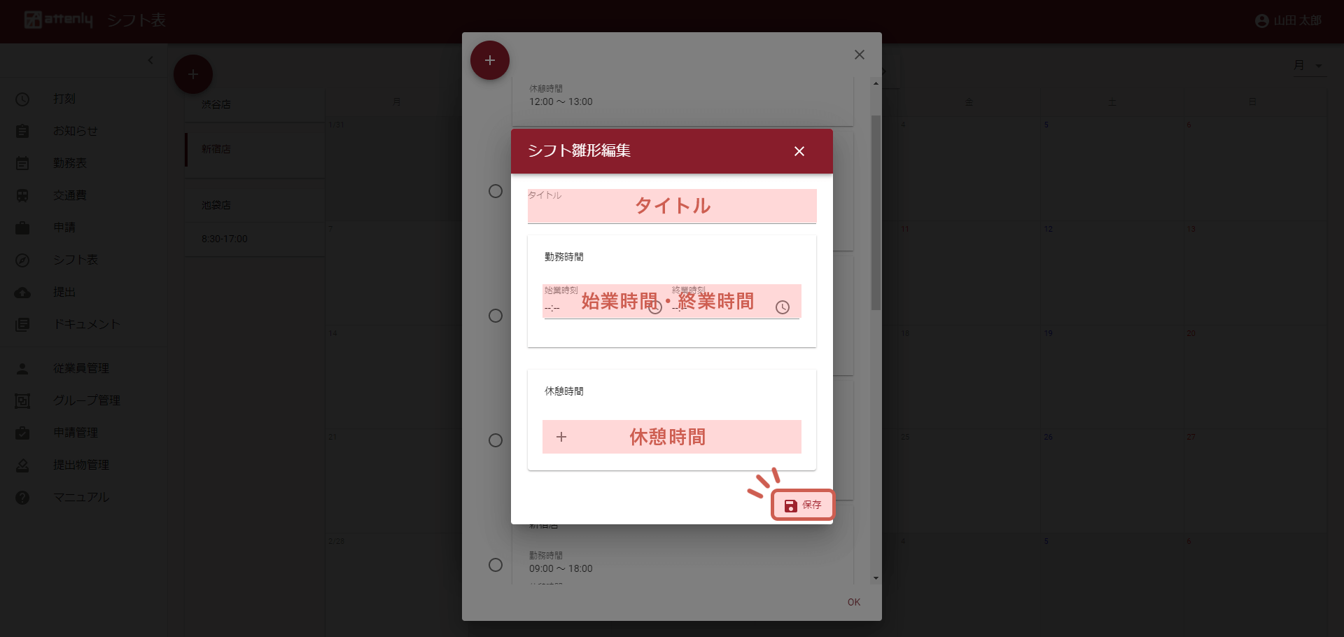 表示ダイアログに沿って「タイトル」「始業時間・終業時間」「休憩時間」を入力し、「保存」をクリックします。